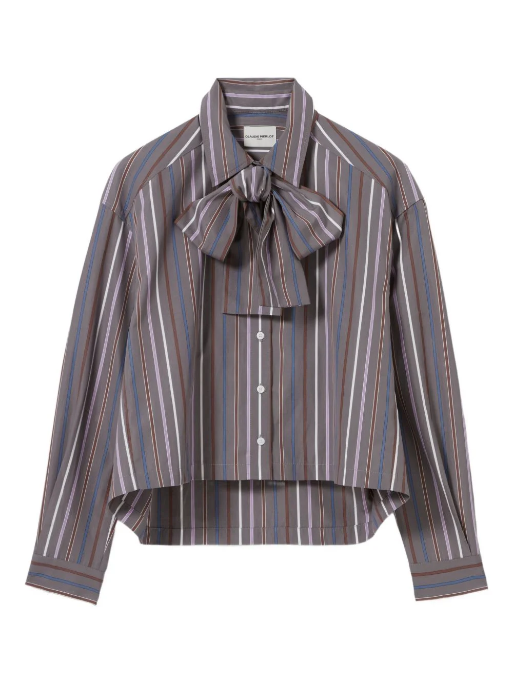 striped bow-tie shirt Highlights - Brown - Vertical stripes - Bow tie fastening - Long sleeves - Button fastening - High-low hem Imported Composition Cotton 100% Washing instructions Machine Wash