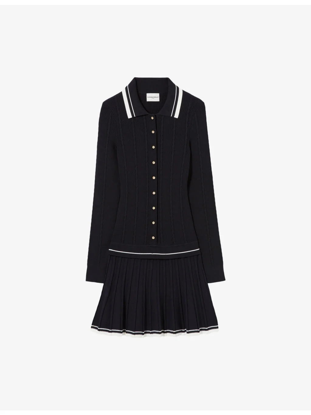 PRODUCT DETAILS - Claudie Pierlot stretch-knit mini dress - 54% viscose, 44% polyamide, 2% elastane - Exposed button fastening at front - Slim fit, collar, long sleeves, gold-toned buttons, pleated skirt, all-over fine knit, cable-knit detailing to top, contrasting striped trims to collar, waist and hem, mini length - Hand wash - True to size - Lightweight, slight stretch Ref: R04508838
