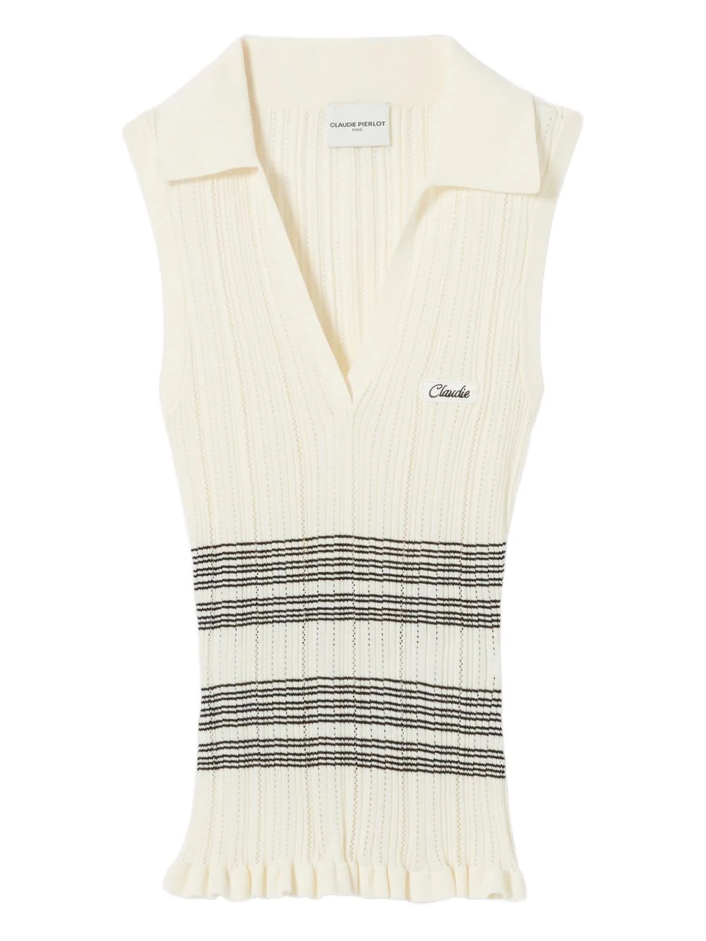 striped V-neck polo top Highlights - Beige - Horizontal stripes - V-neck - Sleeveless - Ruffled hem - Patch detail Imported Composition Viscose 64%, Polyamide 36% Washing instructions Hand Wash
