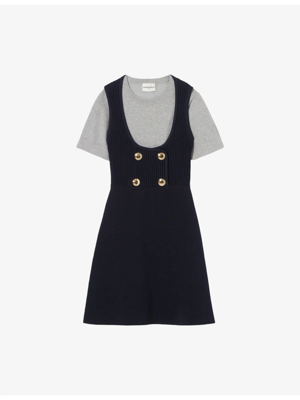 PRODUCT DETAILS - Claudie Pierlot stretch-knit dress - 53% viscose, 45% polyamide, 2% elastane - Slim fit, round neck, short sleeves, knitted pinafore dress with gold-tone buttons - Hand wash - True to size - Model is 5ft 9in/1.75m and wears a size UK 8 - Midweight, slight stretch Ref: R04508871
