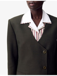 PRODUCT DETAILS - Claudie Pierlot stretch wool-blend blazer - 55% wool, 41% polyester, 4% elastane - Exposed button fastening at front - Regular fit, kimono collar, long sleeves, asymmetric fastening, two flap pockets at the side - Dry clean - True to size - Midweight, non-stretch Ref: R04508914