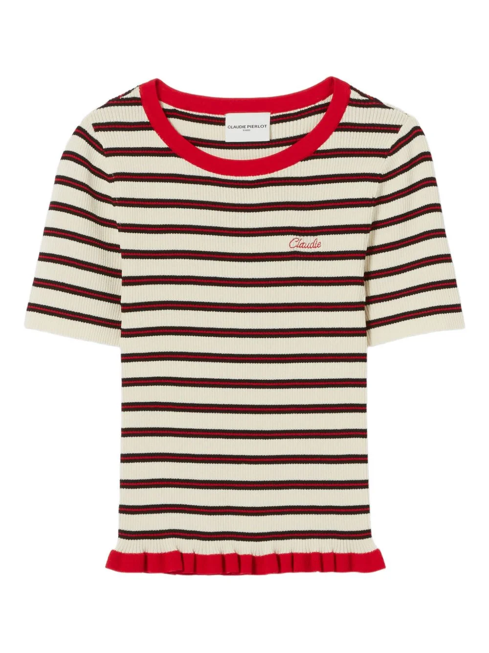 striped embroidered-logo T-shirt Highlights - Beige and red - Striped - Embroidered logo - Ribbed knit - Round neck - Short sleeves Imported Composition Polyester 100%, Viscose 63%, Polyamide 37% Washing instructions Read Manufacturer Guidelines
