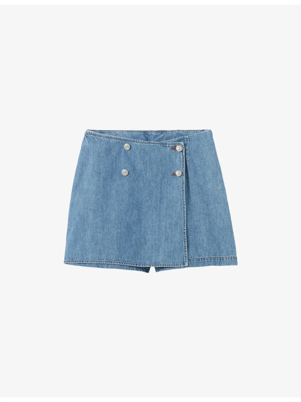 PRODUCT DETAILS - Claudie Pierlot denim skort - 100% cotton - Zip fastening - Regular fit, mid-rise, wrap front, decorative buttons, back pockets, contrast stitching - Machine wash mild - True to size - Midweight, non-stretch Ref: R04599249