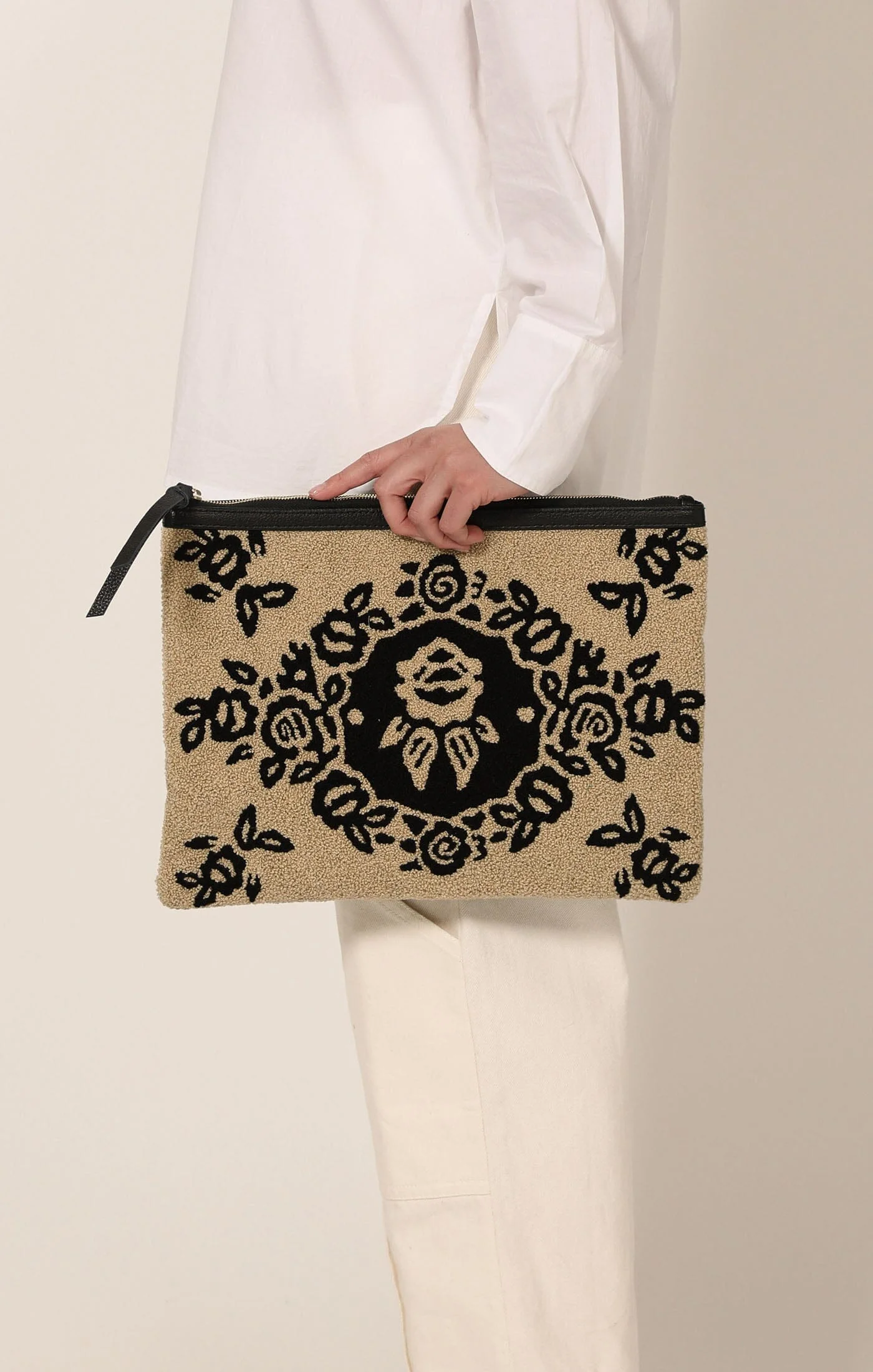 The Botanico Clutch blends practicality with artisanal charm. Designed with a textured floral front and a smooth leather back panel, it features a secure top zipper and a spacious interior—perfect as a laptop sleeve, travel pouch, or everyday carryall. Its bold woven pattern adds a standout touch to any look. DETAILS - Ethically Handmade in Bali - Leather back panel - Exterior zipper - Height: 10.5” - Width: 14.5”