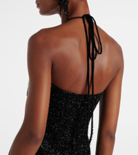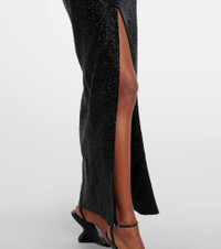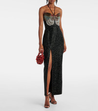 The Mariposa gown by Clio Peppiatt perfectly captures the brand’s signature ethereal aesthetic. This fully hand-embellished garment features a self-tie halterneck, deep front slit, and elegant butterfly motif that seamlessly blends into the design. Product Details - Material: 100% polyester - Care instructions: do not wash - Made in India - Color: black - Designer color name: Black - Item color: black, multicolor - Lining: 100% polyester - Fully lined - Includes: dust bag - Closure: invisible zipper, self-ties, hook fastening - Long vent - Item number: P01054005 Size & Fit - Fits small to size - we recommend trying one size larger - Ideal fit for larger bust sizes - Fitted - Non-stretchy fabric - slit length 72,0cm-28.5" - The model seen in the picture is 178cm-5'10" and wearing a size S