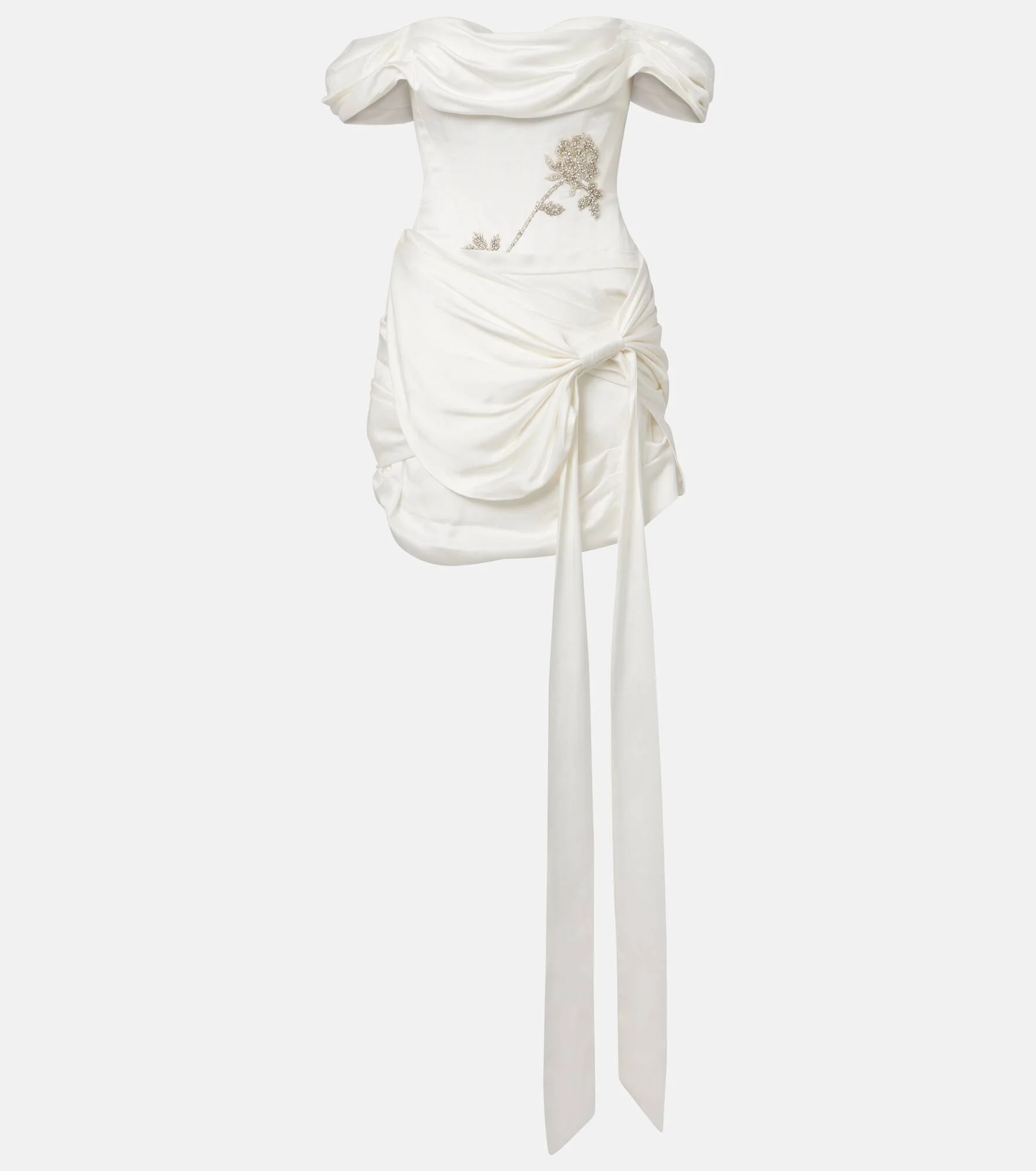 Clio Peppiatt's Paloma minidress is a prime example of the brand's covetable ethereal aesthetic. It's defined by hand-sewn beads placed in an intricate floral pattern, its draped silhouette, and off-shoulder neckline. Product Details - Material: 71% acetate, 29% viscose - Care instructions: spot clean - Made in India - Color: white - Designer color name: Ivory - Item color: ivory - Lining: 100% polyester - Built-in bustier - Collar: cowl neck - Closure: zip and hook fastening - Item number: P01053962 Size & Fit - True to size - Off-the-shoulder - Internal boned corset for support - Fitted bodice, loose skirt - Non-stretchy fabric - The model seen in the picture is 178cm-5'10" and wearing a size XS