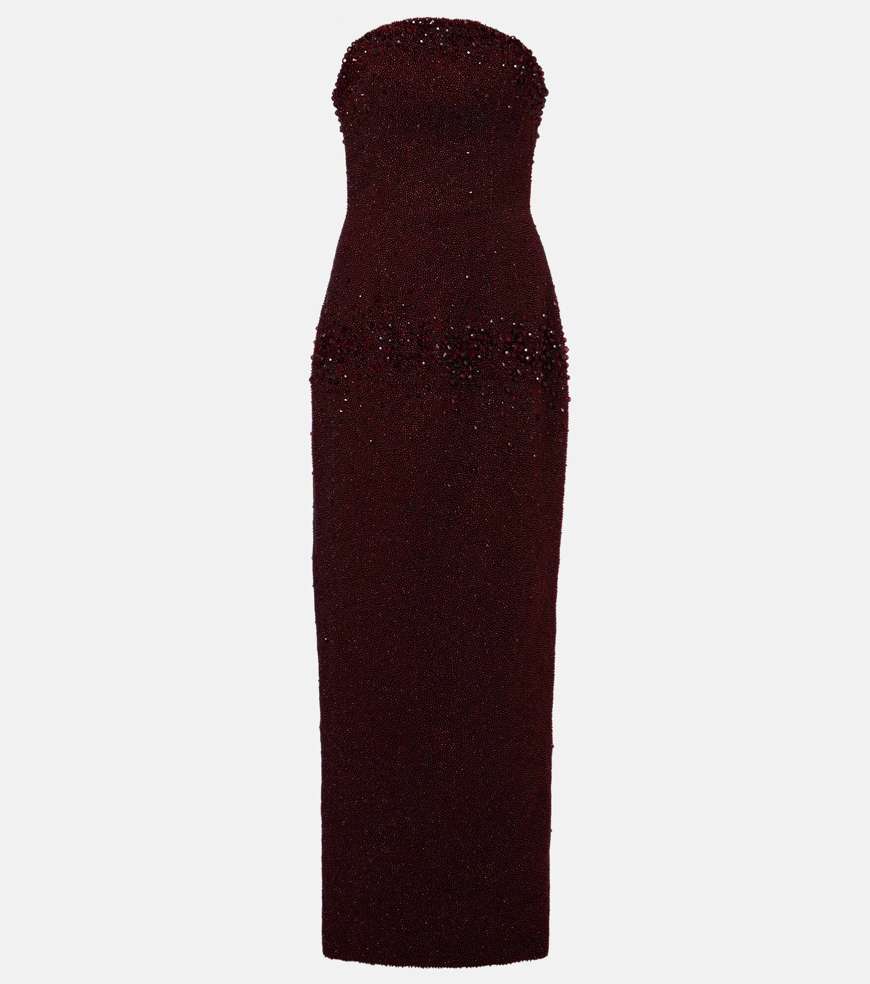 A treasure trove of sparkle, Clio Peppiatt's designs are anything but ordinary. The Tina gown has a strapless design and features signature hand-beaded embellishments. Product Details - Material: 100% polyester - Care instructions: specialist clean - Made in India - Color: burgundy - Designer color name: Cabernet - Item color: burgundy - Lining: 96% polyester, 4% elastane - Closure: concealed zipped back - Hook-fastening built-in bustier - Includes: garment bag - Item number: P01107180 Size & Fit - slit length 48cm-19"
