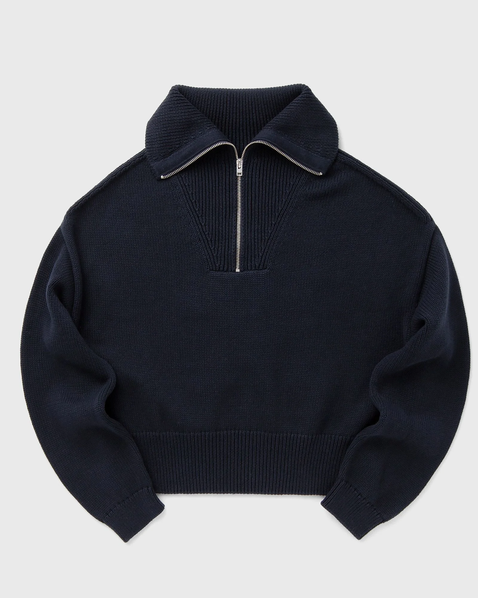 The Closed Cropped Troyer has a cropped length for a modern look. Made from GOTS-certified organic cotton, the sweater offers a soft feel, while the special crochet stitch creates a subtle contrast. - Large collar with zipper - Ribbed cuffs and hem Article number: C96491-951-22-568 Gender: women Color: DARK NIGHT Material: 100% Cotton