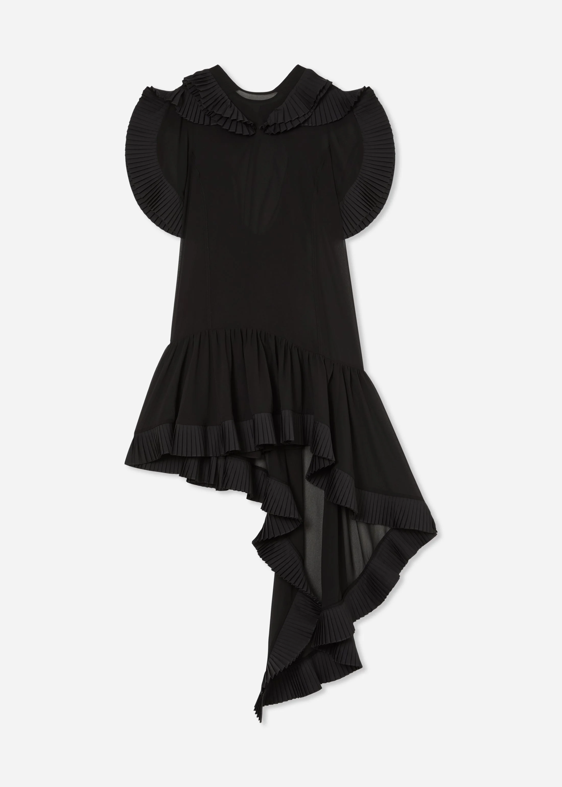 Designed from lightweight black georgette, this sculptural dress features dramatic pleated ruffle applique along the shoulders, sleeves, and hem. The silhouette is softly flared with an asymmetric hemline that cascades into a fluid, high-low drape. A deep scoop back adds contrast to the high neckline and structured detailing, balancing architectural volume with sheer delicacy. Finished with a hidden back zip for a seamless close. Details - Black - 100% Polyester - Back Zipper Closure - Unlined - Dry Clean Only - Style Number: 4048NLSG-F25 Size & Fit - True to size. - Designed to be fitted.