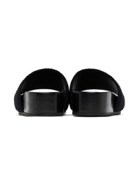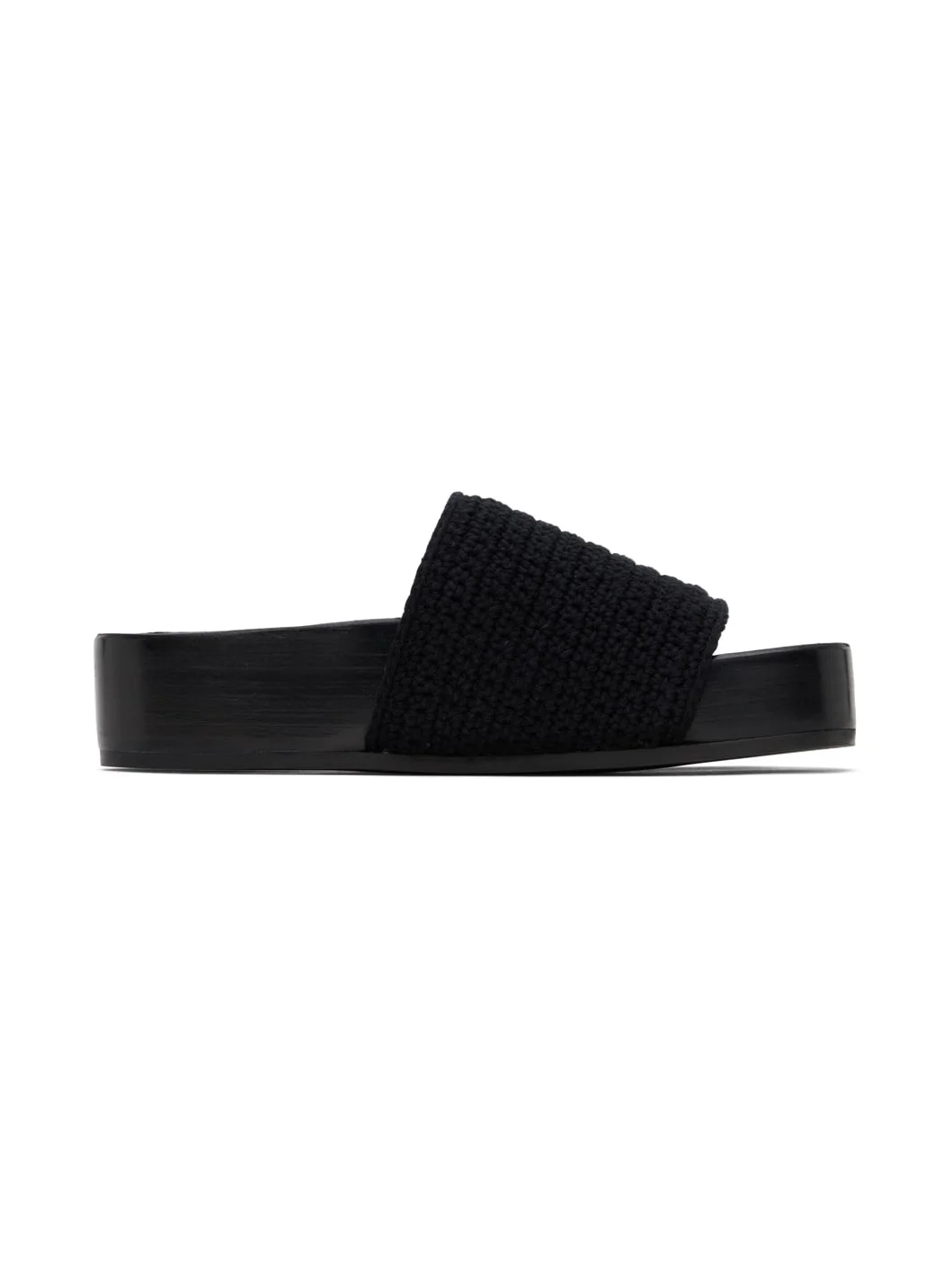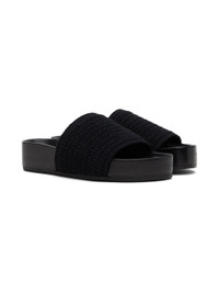 Buffed leather slip-on sandals in black. · Open round toe · Padded crocheted trim at vamp · Logo embossed at molded footbed · Stacked leather sole with rubber injection · Platform: H1.75 in Supplier color: Black Upper: textile, leather. Sole: leather. Made in Italy 231366F124003