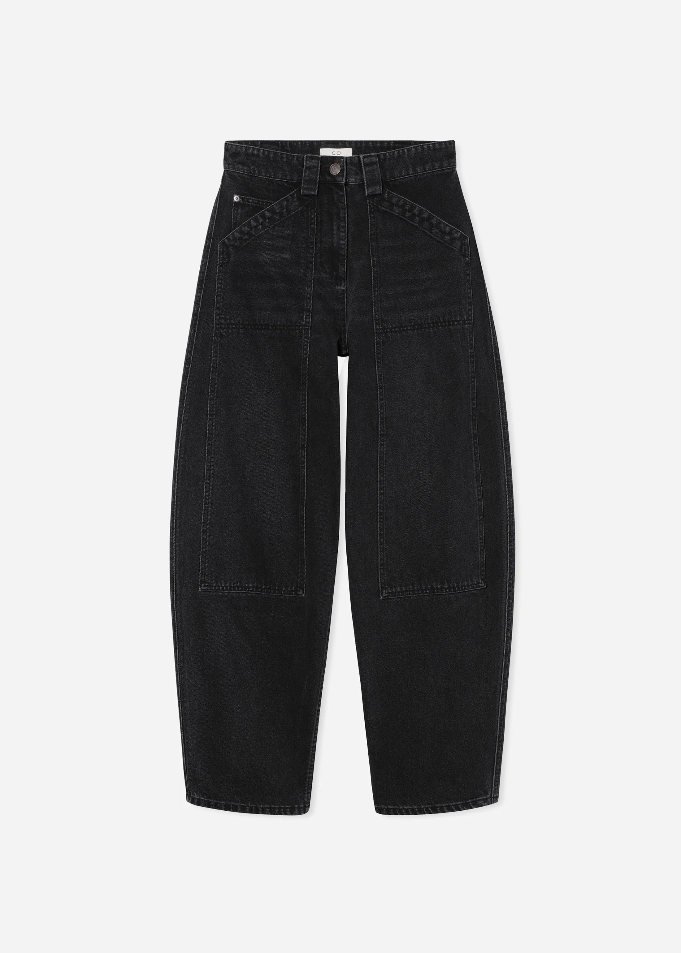 These high-waisted denim pants feature a workwear-inspired barrel shape that combines style with comfort. Crafted from washed black denim, they showcase large patch pockets and contrast stitching for a refined yet functional look. The cotton bias binding adds subtle texture, while the horn button and zip closure ensure durability and ease. Details - Black - 100% Cotton - Dry Clean Only - Style Number: 5180SBD-CORE Size & Fit - In seam is 30" across all sizes. - Model is 5'10 has a 26" waist, and wears a size 26"