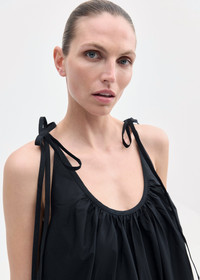 This elegant gathered halter dress is crafted from crisp cotton poplin, offering a lightweight and breathable feel perfect for warm weather. The design features a low scoop neckline with delicate gathers at the chest and Details - Black - 100% Cotton - Dry Clean Only - Style Number: - 4391LCSP-CORE Size & Fit - Relaxed fit. - Measures 41" in total length. - Model is 5'9" wears a size Small.