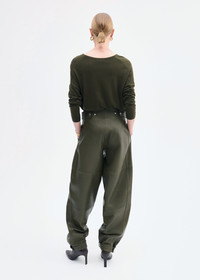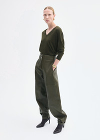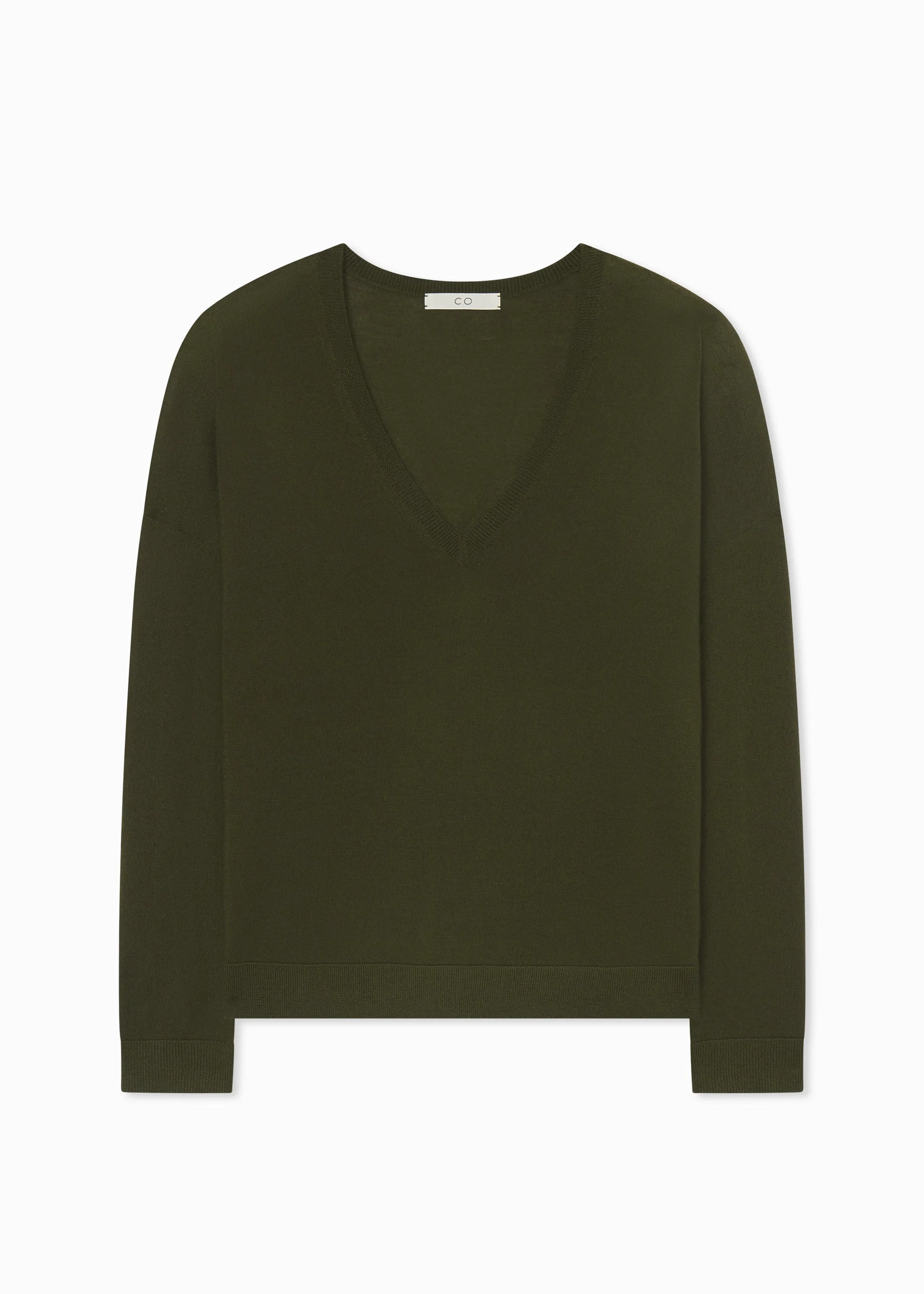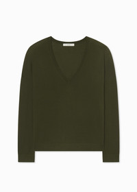 This sophisticated V-neck sweater in a rich olive hue is crafted from fine-gauge cashmere yarn, offering an exceptionally soft and luxurious feel against the skin. Its relaxed fit and drop shoulder design create an effortlessly elegant silhouette. Finished with a ribbed hem, this sweater combines timeless style with comfort, making it an ideal choice for layering or wearing on its own during cooler days. Details - Olive - 100% Cashmere - Ribbed Hem - Dry Clean Only - 7891BCM-PF25 Size & Fit - Designed with a relaxed fit. - We recommend ordering one size down if you prefer a fitted look.