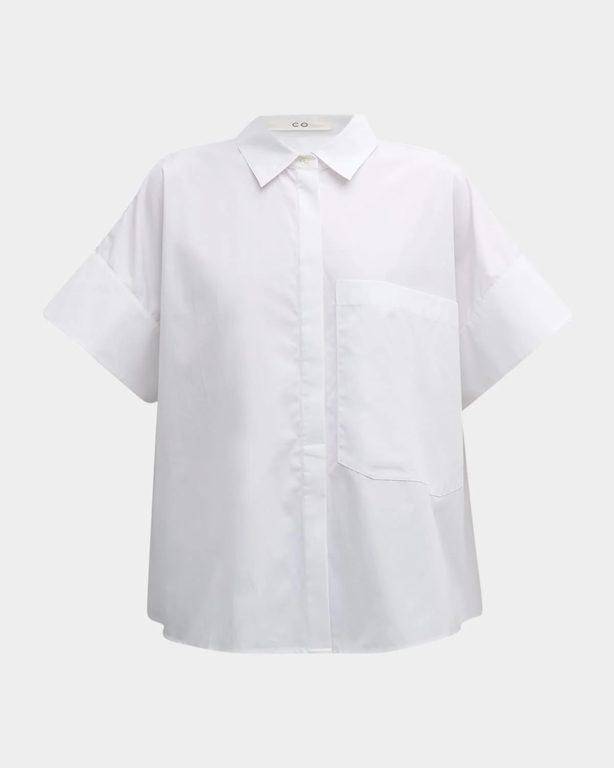 Co shirt featuring a large chest patch pocket and sleeve panels Point collar; concealed button front Short sleeves Boxy fit Cotton Imported