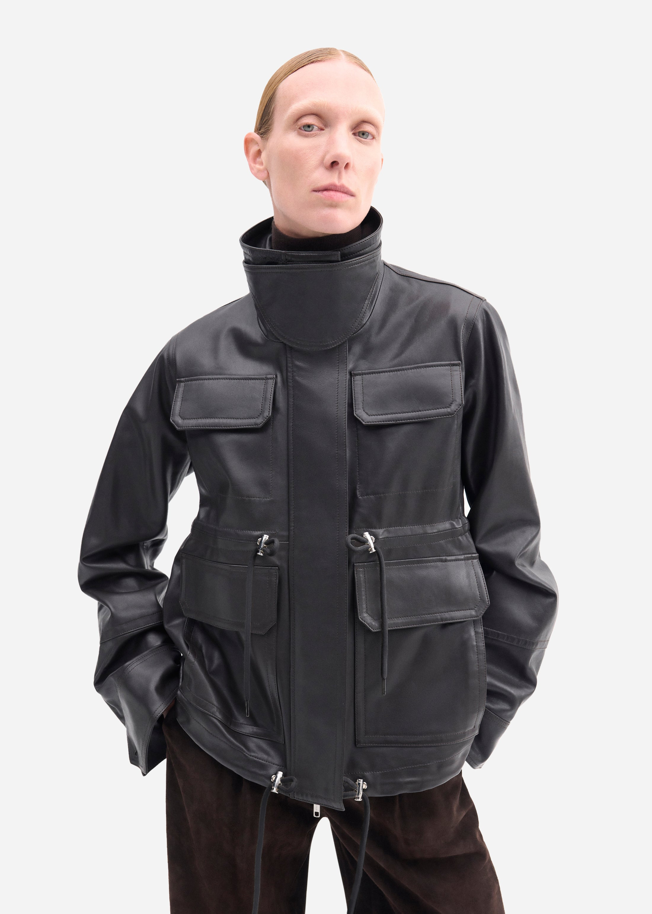Structured and commanding, this short military-inspired jacket is crafted from supple lambskin leather and finished with functional drawcords at the waist and hem for a customizable fit. Features oversized flap pockets, a stand collar, and tonal stitching. A bold layering piece with utilitarian edge and luxe attitude. Details - Chocolate - 100% Lambskin - Oversized Flap Pockets - Drawstring Waist - Dry Clean Only - Style Number: 6205PSGV-PF25 Size & Fit - 26" in overall length - True to size. We recommend taking your normal size