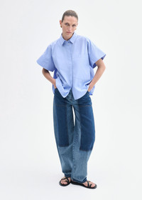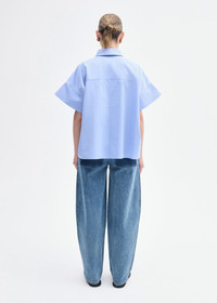 Short-sleeved shirt cut from crisp cotton poplin, featuring sculptural statement sleeves and hidden placket. Designed with a boxy silhouette that wears effortlessly untucked or creates shape when tucked into a high-waisted skirt or pant. The oversized chest pocket adds a subtle utilitarian touch. Details - Blue - 100% Cotton - Dry Clean Only Size & Fit - Designed with a boxy cut. - Generous fit in the chest. - We recommend ordering one size down if you prefer a fitted look. - We recommend ordering two sizes down if you are petite.