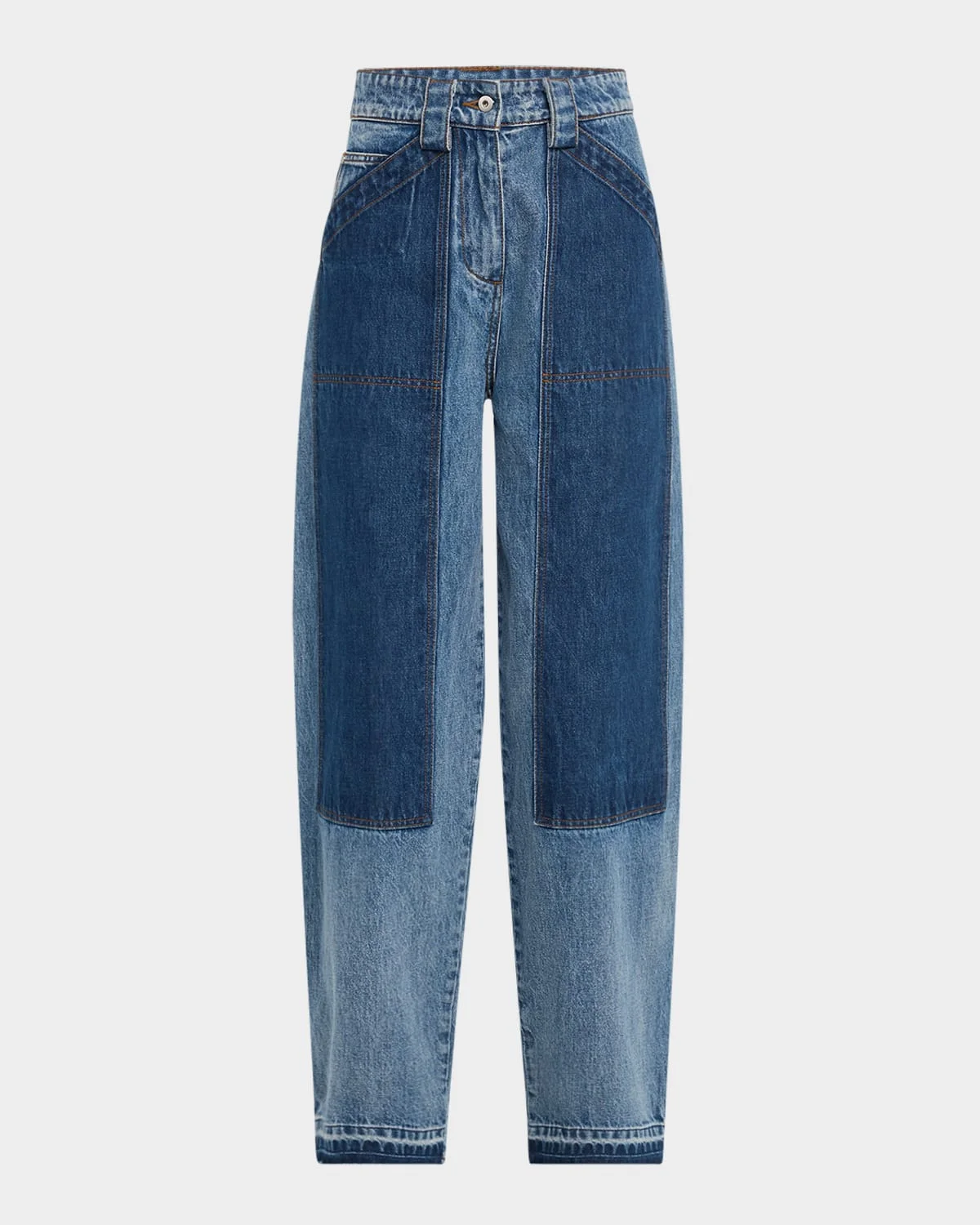 - Co jeans in a denim patchwork design with exaggerated constrasting pocket details - High rise - Four-pocket style - Full length - Straight legs - Button/zip fly; belt loops - Cotton - Imported