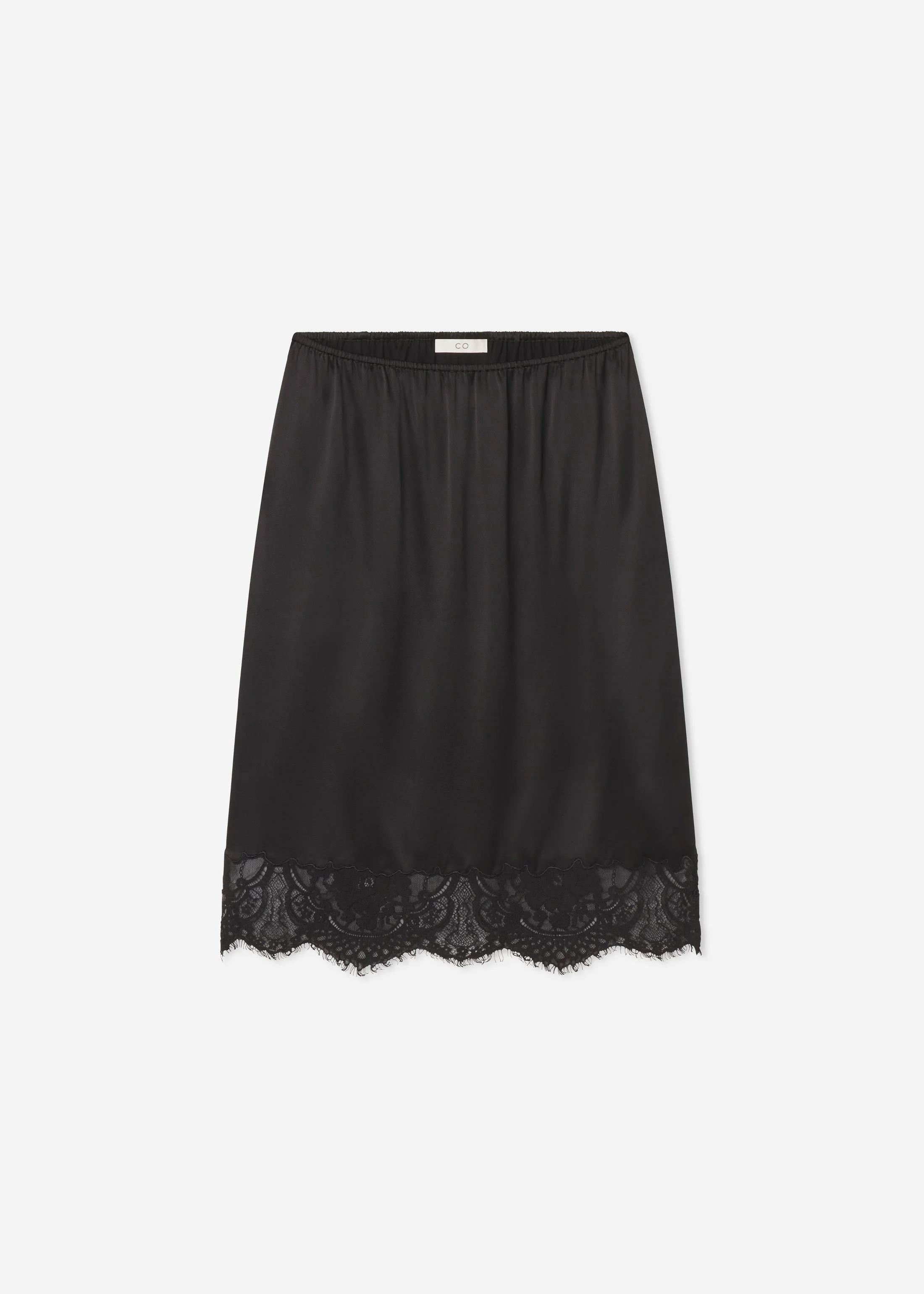 An essential underpinning with an updated French lace delicately trimming the hemline. Cut with a clean, fluid line, it falls from a soft elastic waistband to skim the body with ease. Wear it as a foundation beneath tailoring or let the lace edge read subtly on its own. Details - Back - 100% Silk - Elastic waistband - Dry Clean Only - Style Number: 3262CSSC Size & Fit - Elastic waistline. - Intended to sit at the natural waistline. - Fits true to size. Size up for a more relaxed drape