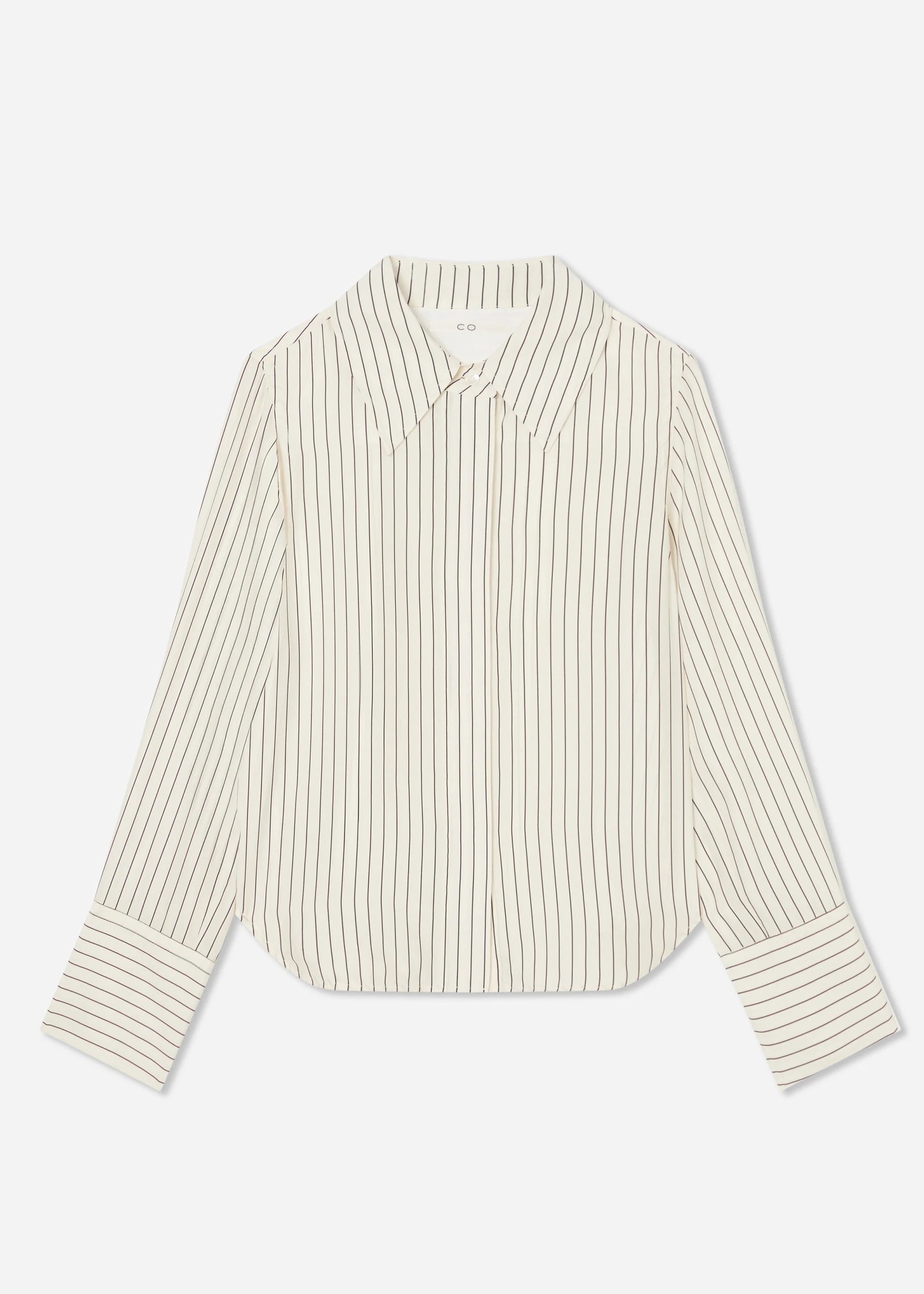 A fluid shirt in pure silk with a fine vertical stripe. The pointed collar and covered placket keep the line clean. Cuffs are cut with a contrast horizontal stripe for a quiet detail. Worn loose or tucked in, it moves easily from tailoring to denim. Details - Ivory Stipe - 100% Silk - Lightweight - Long sleeves with wide button cuffs - Dry Clean Only - Style Number:1001NLSS Size & Fit - Fits true to size. - Curved hem designed to be worn tucked or untucked - Model Height is 179 cm / 5'11 in