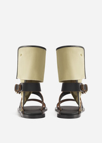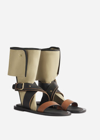 Crafted in ecru canvas with contrasting smooth black and cognac leather straps, this modern take on the gladiator sandal features a structured wrap-around cuff and adjustable buckled ankle strap. Designed with a flat profile and open toe, it blends utilitarian design with sculptural elegance. Details - Cognac/Brown/Ecru - 100% Calfskin - Made in Italy - Style Number: 0081CVS-PF25 Size & Fit - True to size with a secure, structured fit. - Ideal for regular to slightly wider feet. - 10mm