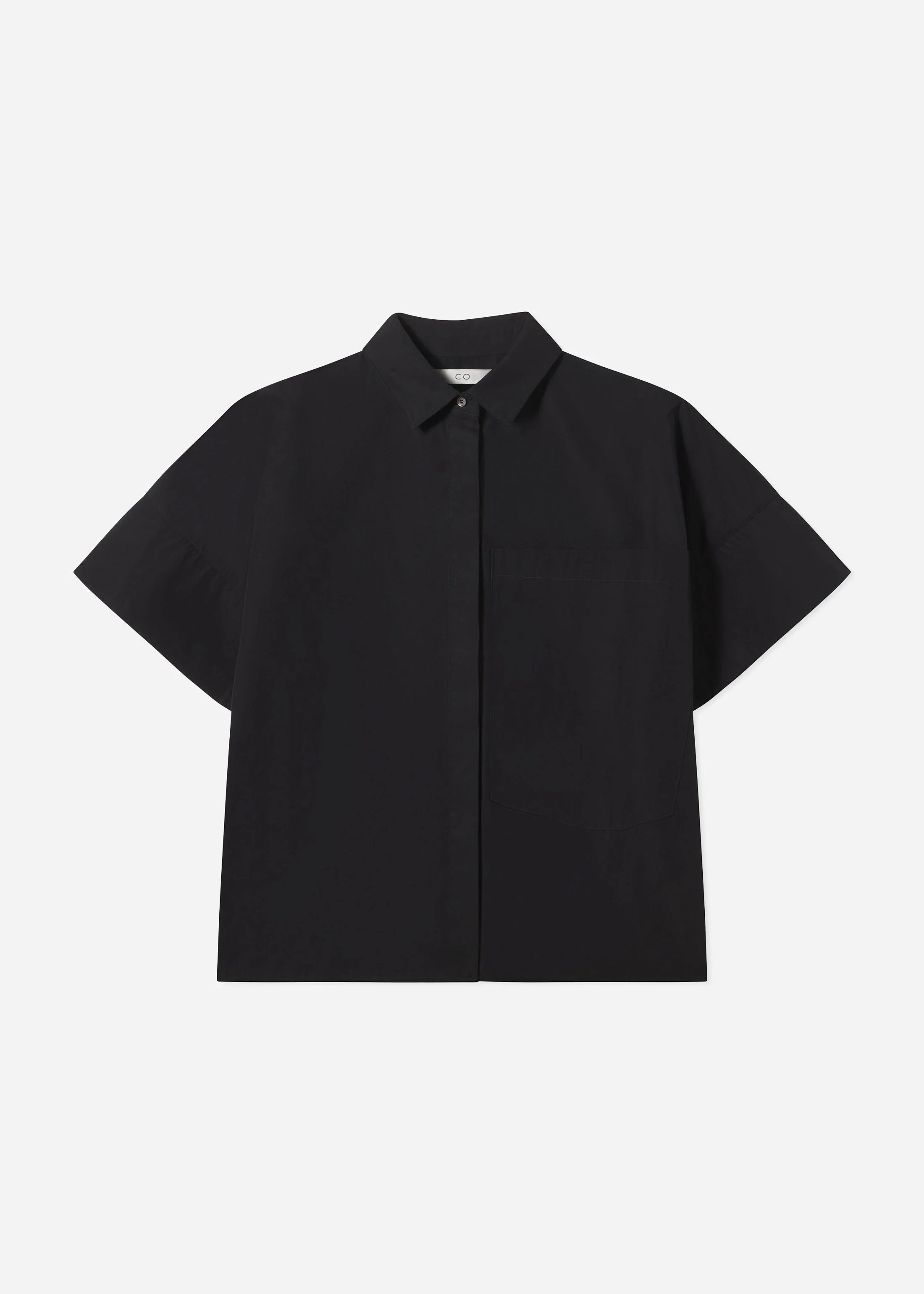 Short-sleeved shirt cut from crisp cotton poplin, featuring sculptural statement sleeves and hidden placket. Designed with a boxy silhouette that wears effortlessly untucked or creates shape when tucked into a high-waisted skirt or pant. The oversized chest pocket adds a subtle utilitarian touch. Details - Black - 100% Cotton - Dry Clean Only Size & Fit - Designed with a boxy cut. - Generous fit in the chest. - We recommend ordering one size down if you prefer a fitted look. - We recommend ordering two sizes down if you are petite.