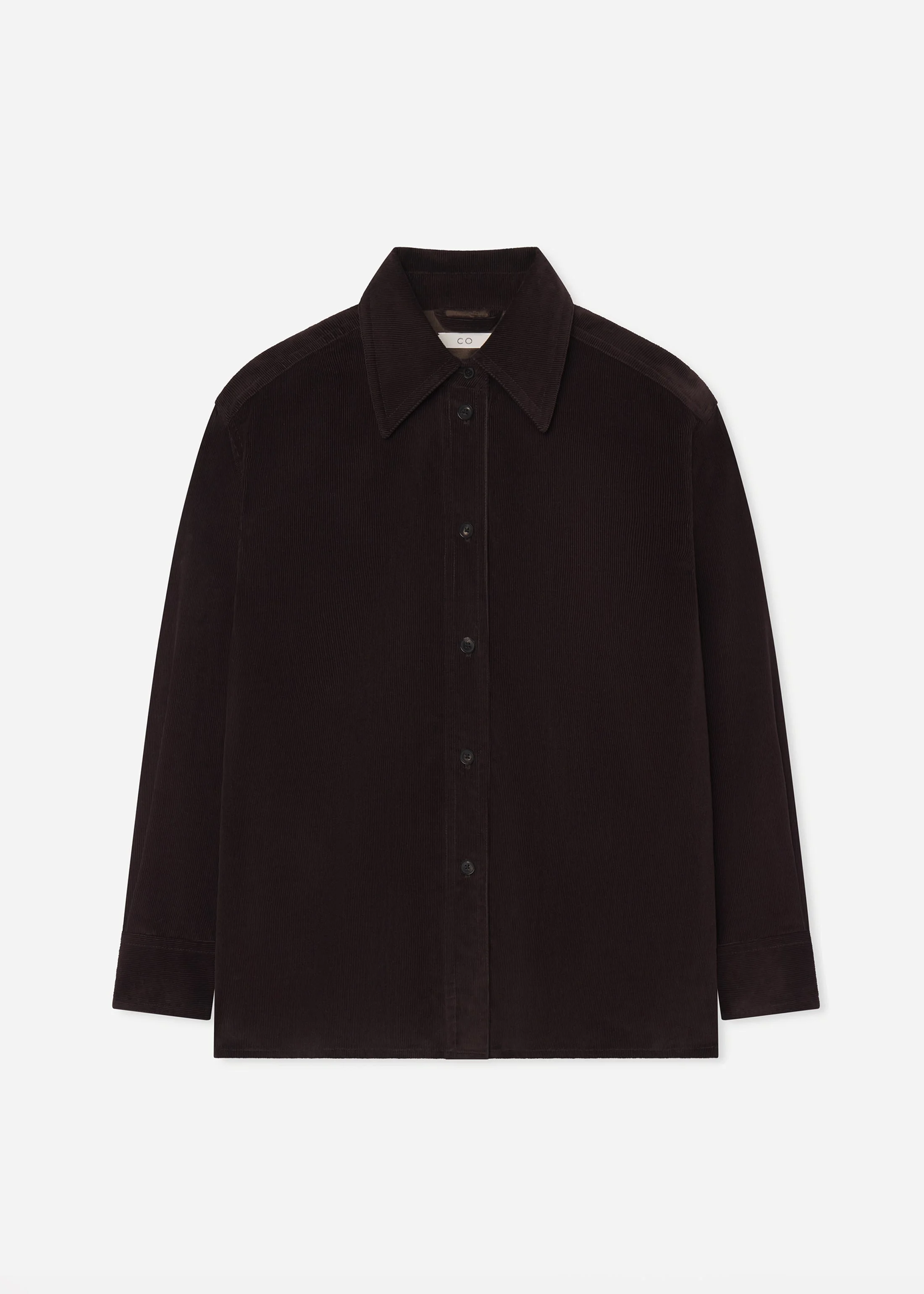 This button down shirt is crafted from wide-wale cotton corduroy with a soft, velvety hand and tailored weight. Designed with a pointed collar, button front placket, and minimal topstitching, the silhouette is clean and slightly boxy for a modern, relaxed fit. Details - Chocolate - 100% Cotton - Dry Clean Only - Style Number: 2331PCC-F25 Size & Fit - Designed to be oversized with a relaxed fit.