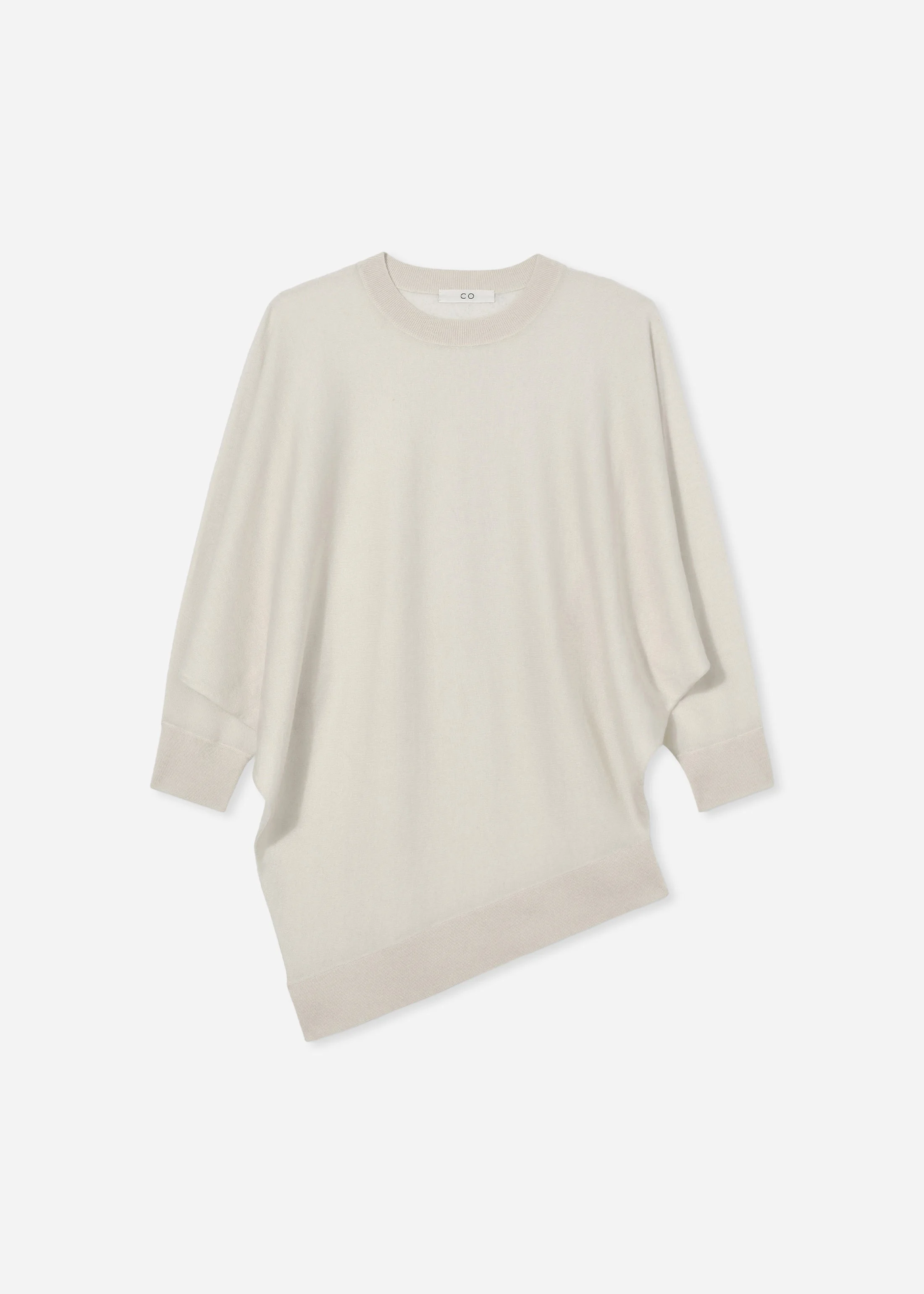 An ultra-lightweight crewneck knit crafted from fine-gauge cashmere. Designed with a drop shoulder, asymmetrical drape, and bracelet-length sleeves, this piece offers a fluid silhouette with quiet sophistication. Details - 100% Cashmere - Ivory - 7718BCM-CORE Size & Fit - Designed for a relaxed fit with a draped hem; size down for a closer silhouette. - Model is 5'10" 34" chest wearing size small.