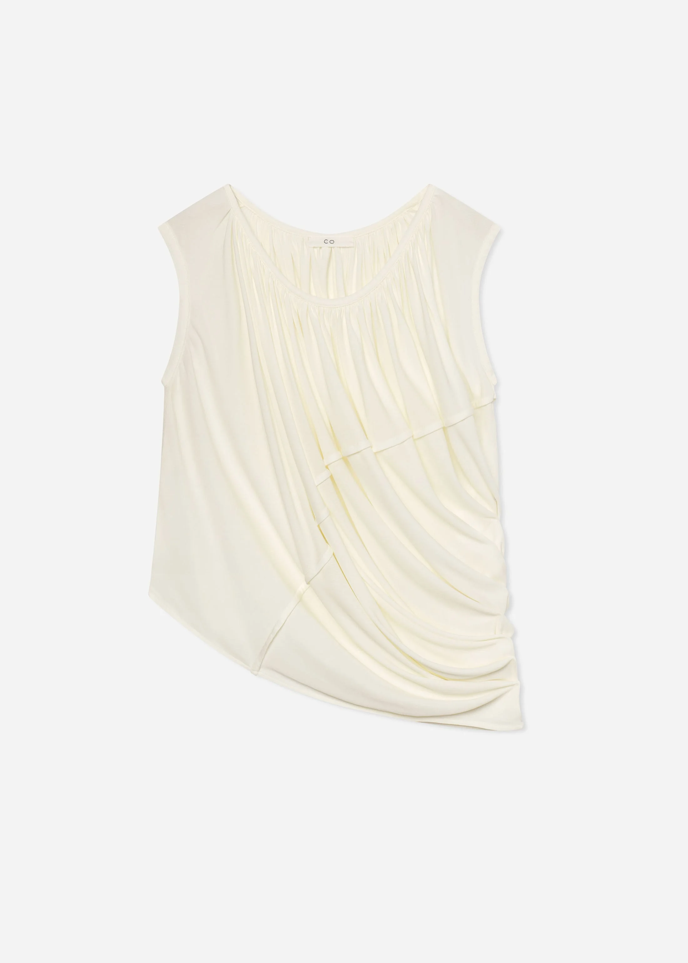 A modern take on timeless elegance. This sleeveless top is crafted from a light weight crepe and features a round neckline with delicate cap sleeves. Asymmetric draping creates graceful movement and a flattering silhouette. Effortlessly refined—perfect for dressing up or down. Details - Ivory - 100% Viscose - Dry Clean Only - 2645SJVI-PF25 Size & Fit - True to size. - Relaxed Fit. - Model is 5'10" and wears a size small