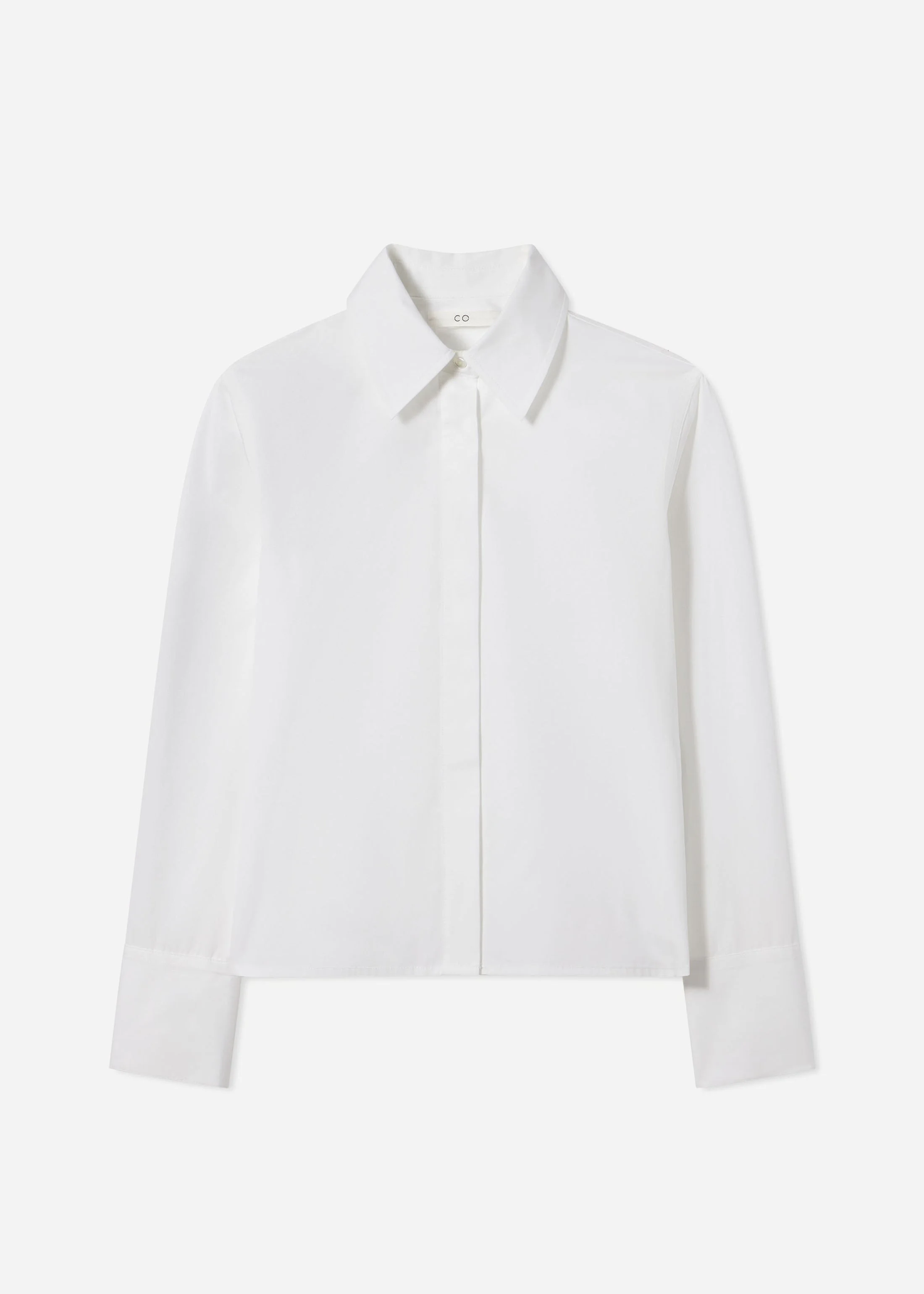 This tailored, straight-cut button-down shirt is crafted from cotton poplin and features mother-of-pearl buttons concealed within a hidden placket. Finished with bias binding, it is designed to be elegantly tucked into skirts or trousers. Details - White - 100% Cotton - Mother of Pearl Buttons - Dry Clean Only - Style Number: 1453LCSP-CORE Size & Fit - Measures 25" in overall length. - Relaxed fit. See size guide.