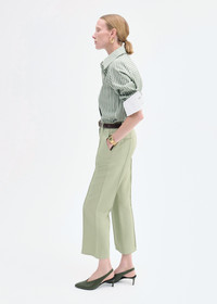 Crafted from crisp cotton poplin with incisive stripes. This classic shirt features a sharp point collar, covered placket with hidden mother-of-pearl buttons, and French seams for a clean finish. The fit is tailored through the shoulders and body—structured yet fluid—with enough ease for a relaxed tuck or rolled sleeve. Details - Green and White - 100% Cotton - 1001TMRS-PF25 Size & Fit - S=34" chest. 2" grade circumference between sizes. - 25" in total length across all sizes - Model is 5'10" and wears a size small