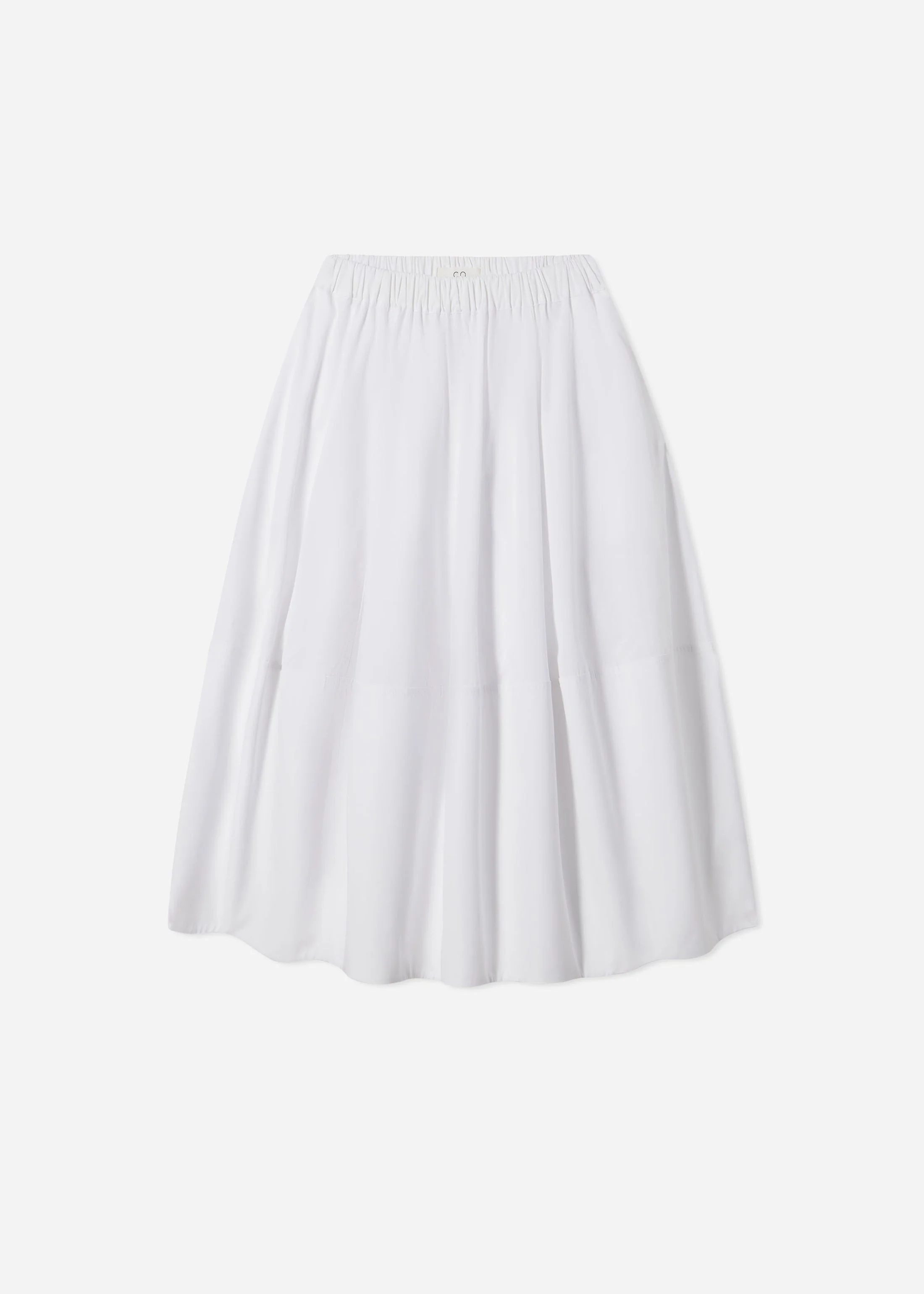 This elegant midi skirt in white cotton poplin features a comfortable elastic waistband that ensures a perfect fit. Its gathered design creates a voluminous silhouette, enhancing movement and grace. The tiered wide cuff at the hem adds both structure and a refined flair, making it a standout piece in any wardrobe. Ideal for pairing with tucked-in tank tops or breezy blouses. Details - White - 100% Cotton - Elasticated Waist - Dry Clean Only - Style Number: 3513LCSP-CORE Size & Fit - Total length 30" across all sizes. - A size Small measures 26" in the waist
