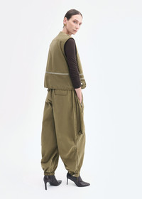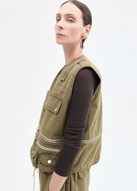 A functional layer with military-inspired detailing. This gilet is crafted from garment-dyed cotton for vintage, broken-in feel and olive khaki tone. Designed with multiple utility pockets, metal zip closures, and D-ring hardware, it features an adjustable drawcord hem for a customizable fit. Perfect for layering over knits or outerwear with utilitarian edge.> Details - Olive - 100% Cotton - 9370SGDP-PF25 Size & Fit - True to size. - Model is 5'10" and wears a size small
