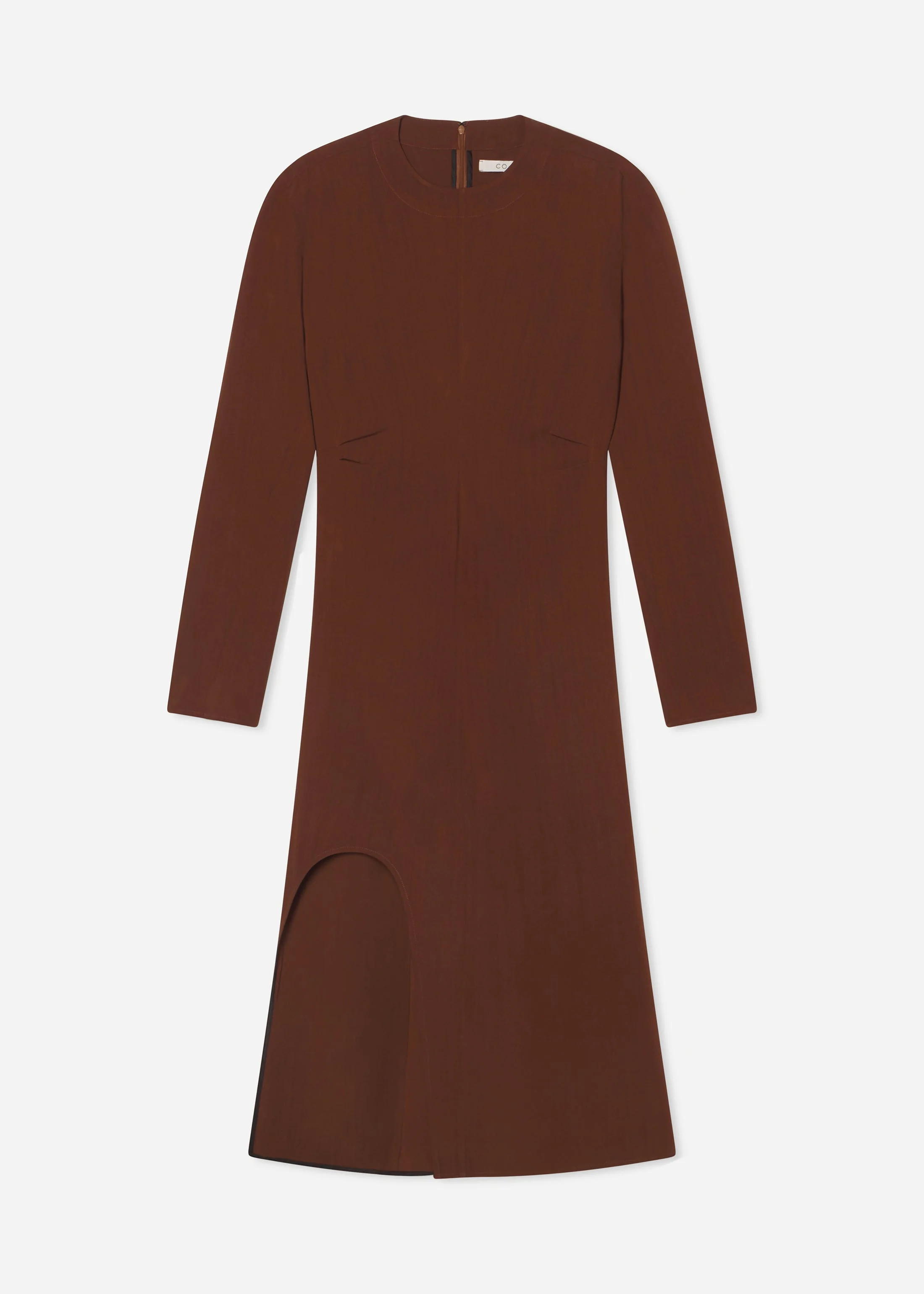 Cut in a smooth viscose wool blend, this long-sleeved dress features a clean, tailored silhouette with subtle darting at the bust and a sculptural keyhole slit at the hem. The minimalist crew neckline and concealed back zip maintain a streamlined finish, while the rich moose brown hue adds understated depth. A refined, modern piece that moves effortlessly from day to evening. Details - Moose - 74% Viscose 26% Virgin Wool - Dry Clean Only - Style Number: 4034BVW-F25 Size & Fit - True to size. - Designed to be fitted.