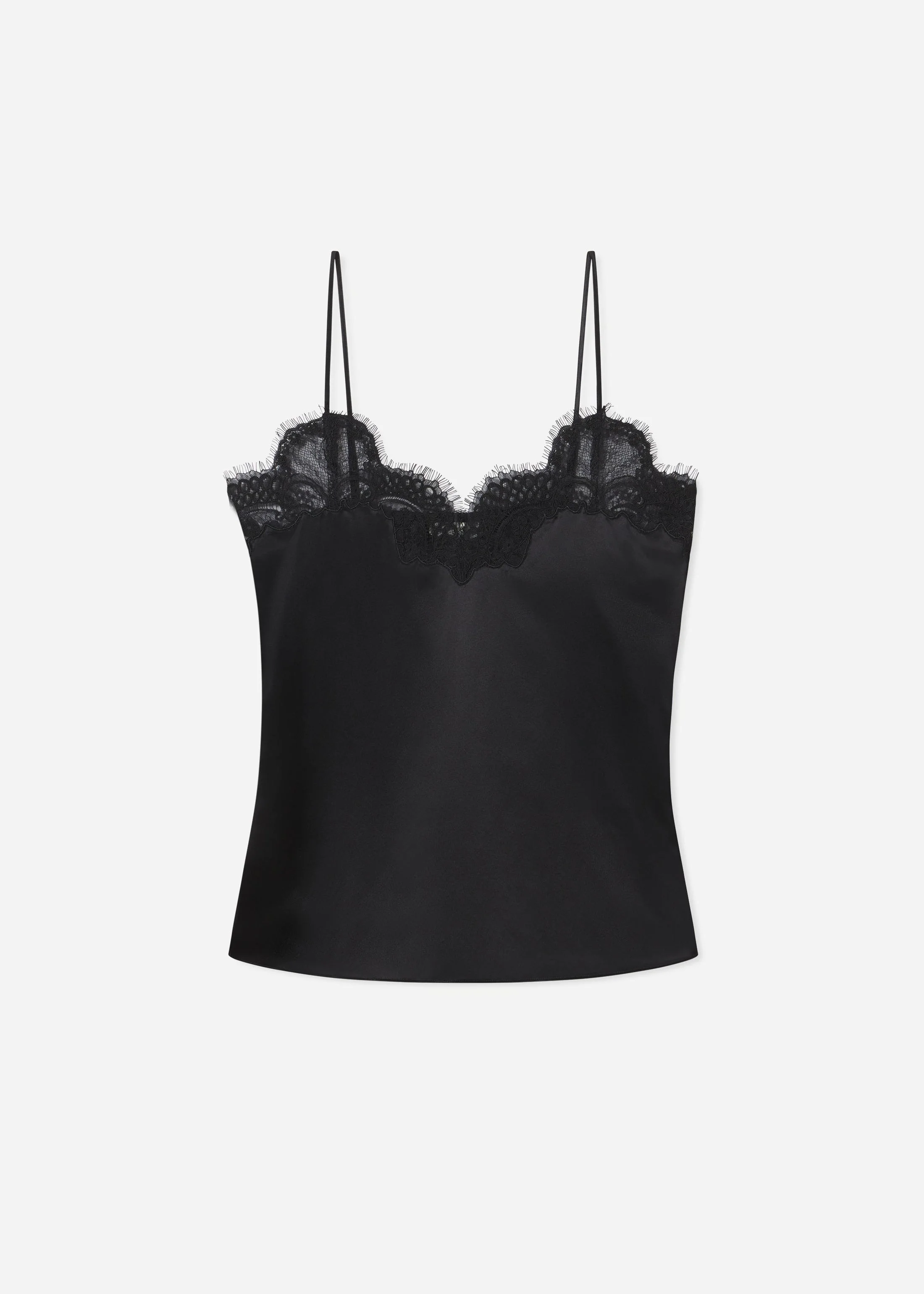 An essential underpinning with an updated French lace delicately trimming the neckline. Bias-cut silk satin glides gracefully against the skin. Adjustable spaghetti straps and cleverly positioned elasticized back ensure proper fit. Details - Black - 100% Silk - Adjustable Straps - Dry Clean Only - Style Number: 2655CSSC-ESSN Size & Fit - Generous fit. We recommend sizing down. - Adjustable Straps