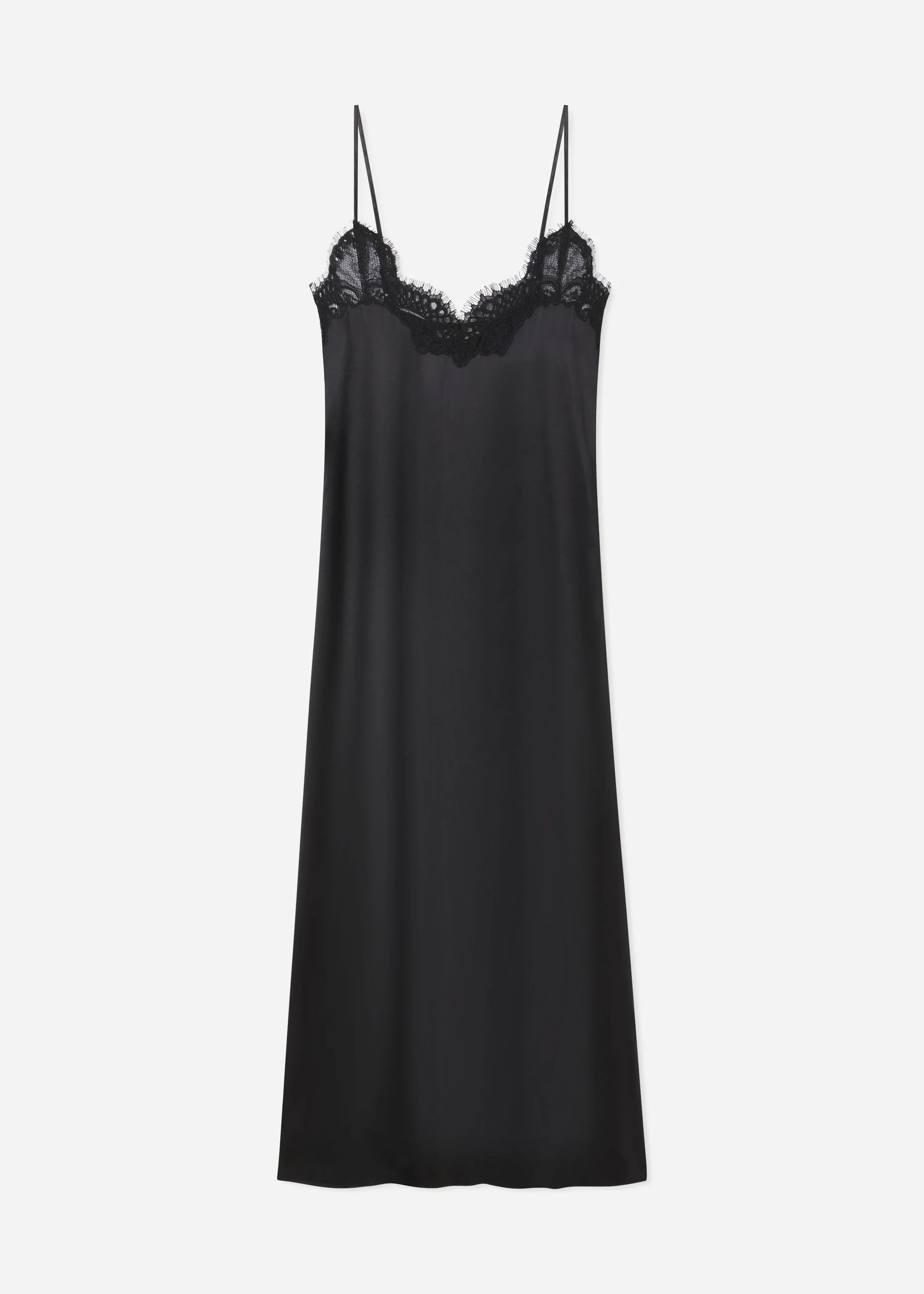 This elegant long slip dress features 16mm opaque bias-cut silk satin that softly caresses the skin. The neckline is adorned with delicate French lace, complemented by adjustable spaghetti straps. Finished with a refined French seam and a subtle baby hem for a polished look. Details - Black - 100% Silk - Trim: 50% Cotton 30% Viscose 20% Polyamide - Adjustable Straps - Dry Clean Only - Style Number: 4704CSSC-CORE Size & Fit - Relaxed fit. Midi length - Measures 47" in total length. - Model is 5'9" 30" bust and wears a size Small.
