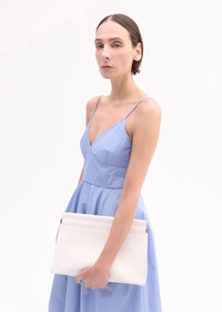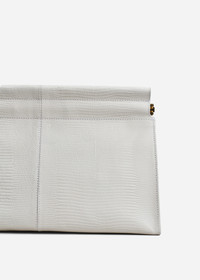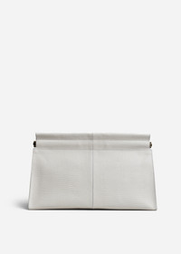 This large leather clutch in a classic ivory combines timeless elegance with practical design. Crafted from finely stamped leather, it features a snap frame closure that ensures secure and easy access. The interior is lined with soft suede, offering a luxurious feel, and includes a dedicated card pocket to keep essentials organized. Accented with subtle gold hardware, this clutch adds a refined touch to any ensemble. Expertly made in Italy, it embodies superior craftsmanship and style. Details - Ivory - 100% Calfskin - Suede Lining - Card Pocket - Made in Italy - Style Number: 0757LIZ-IVO Size & Fit - (W)32cm x (L)20.3cm x (D)9.9cm
