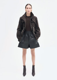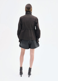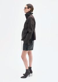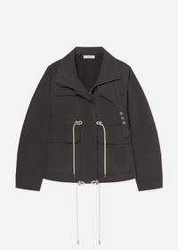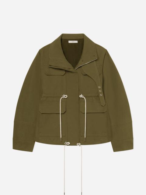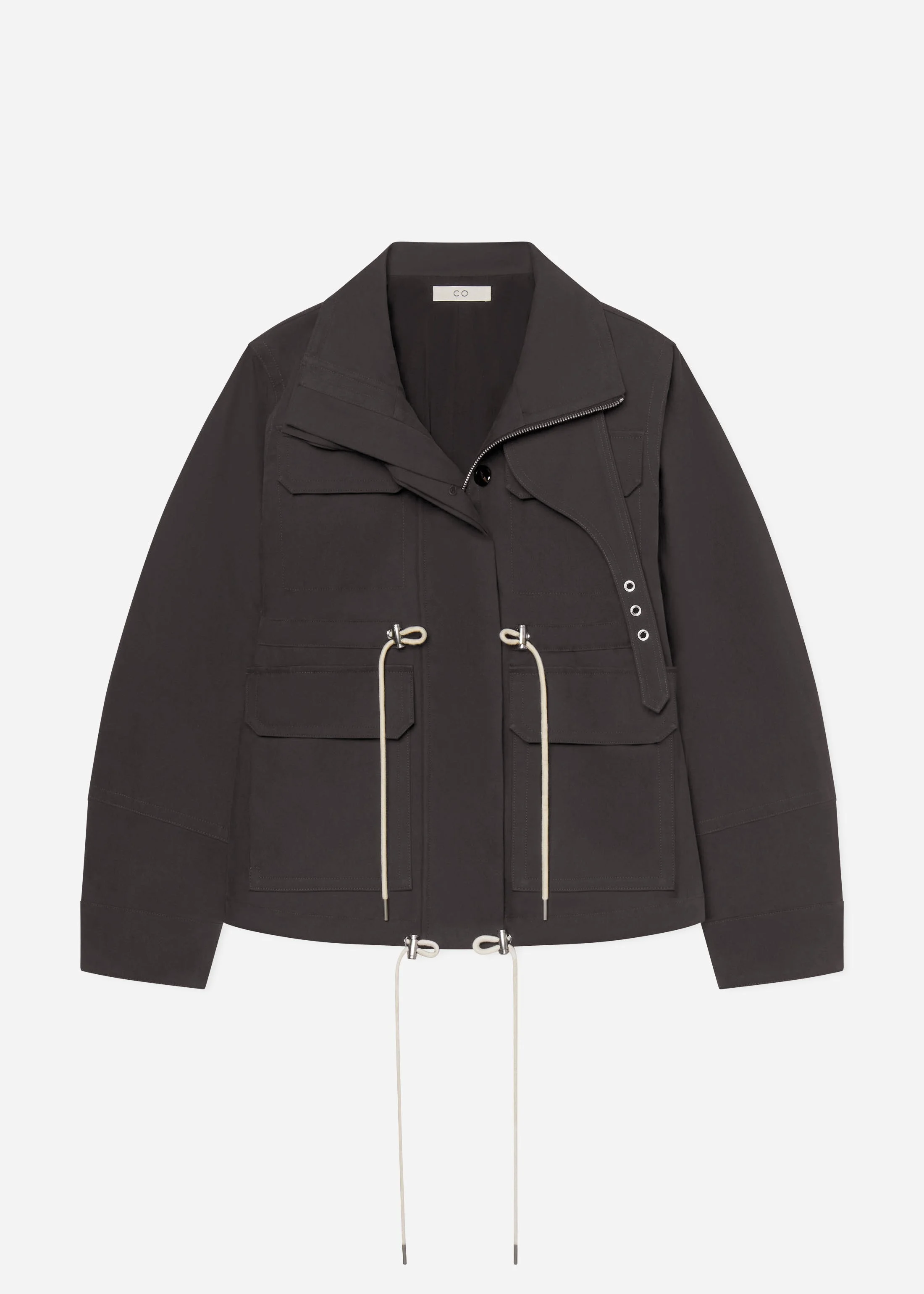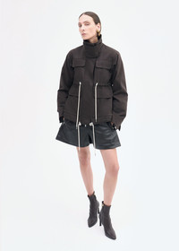 A refined take on utility. This short military-style jacket is cut from soft, brushed cotton twill for a matte, tactile finish. Designed with oversized flap pockets, tonal buttons, and contrast drawcords at the waist and hem to adjust the shape. Lightweight yet structured, it’s the perfect transitional layering piece. Details - Chocolate - 100% Cotton - Dry Clean Only - 6205EBC-PF25 Size & Fit - True to size. - Model is 5'10" and wears a size small