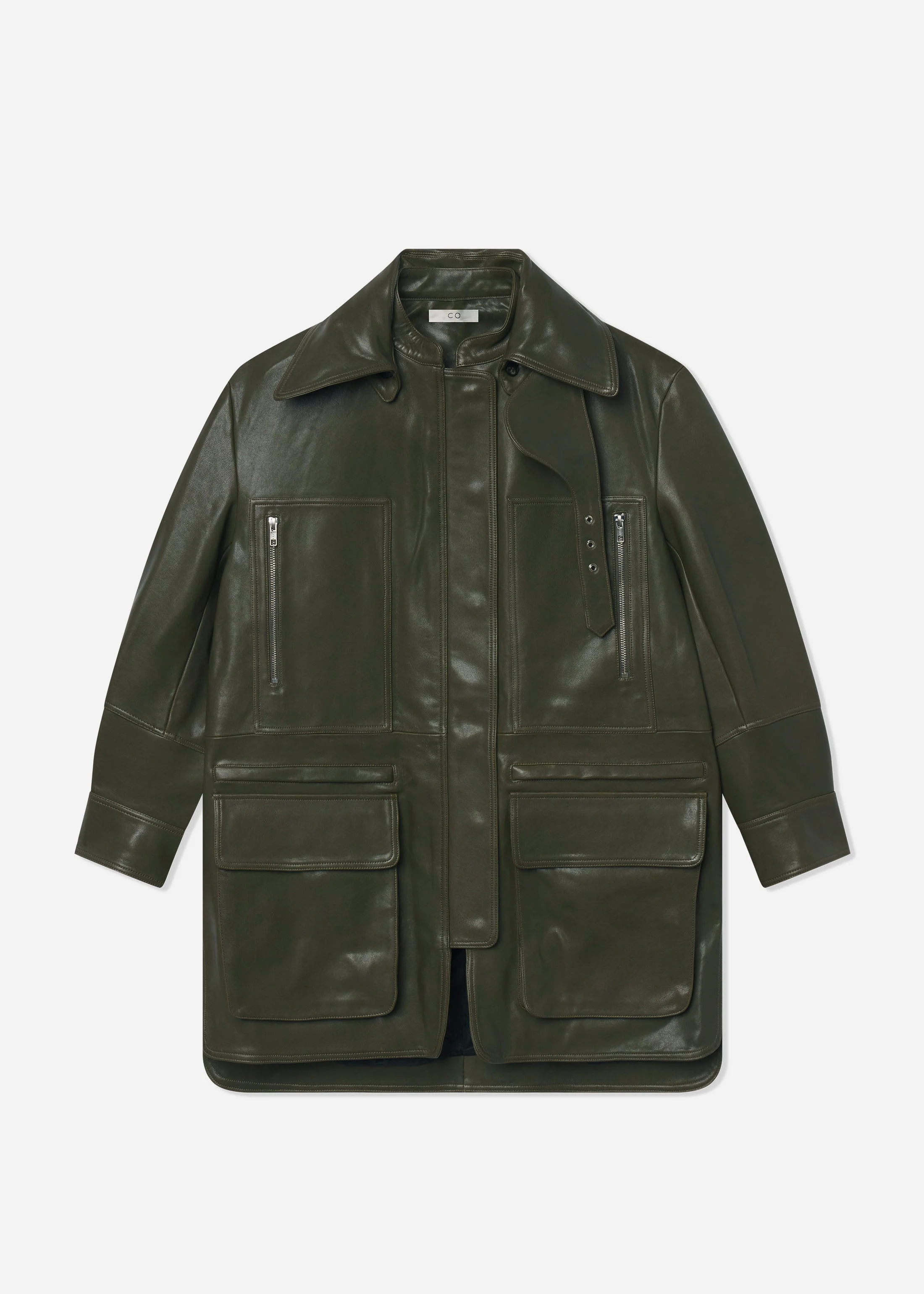 Crafted from supple, grained lambskin, this structured utility coat is cut with a wide shoulder and a generous fit through the chest and bodice. A detachable collar, gusseted cuffs, and oversized flap pockets emphasize its utilitarian edge, while an internal drawcord subtly defines the waist. Concealed zip and snap front closures maintain a clean, architectural silhouette. Half-lined for light structure and seasonless layering. Details - Olive Green - 100% Lambskin - Dry Clean Only - 6605PSGV-PF25 Size & Fit - Designed to be oversized. - Approx 34" in overall length - Model is 5'10" and wears a size small