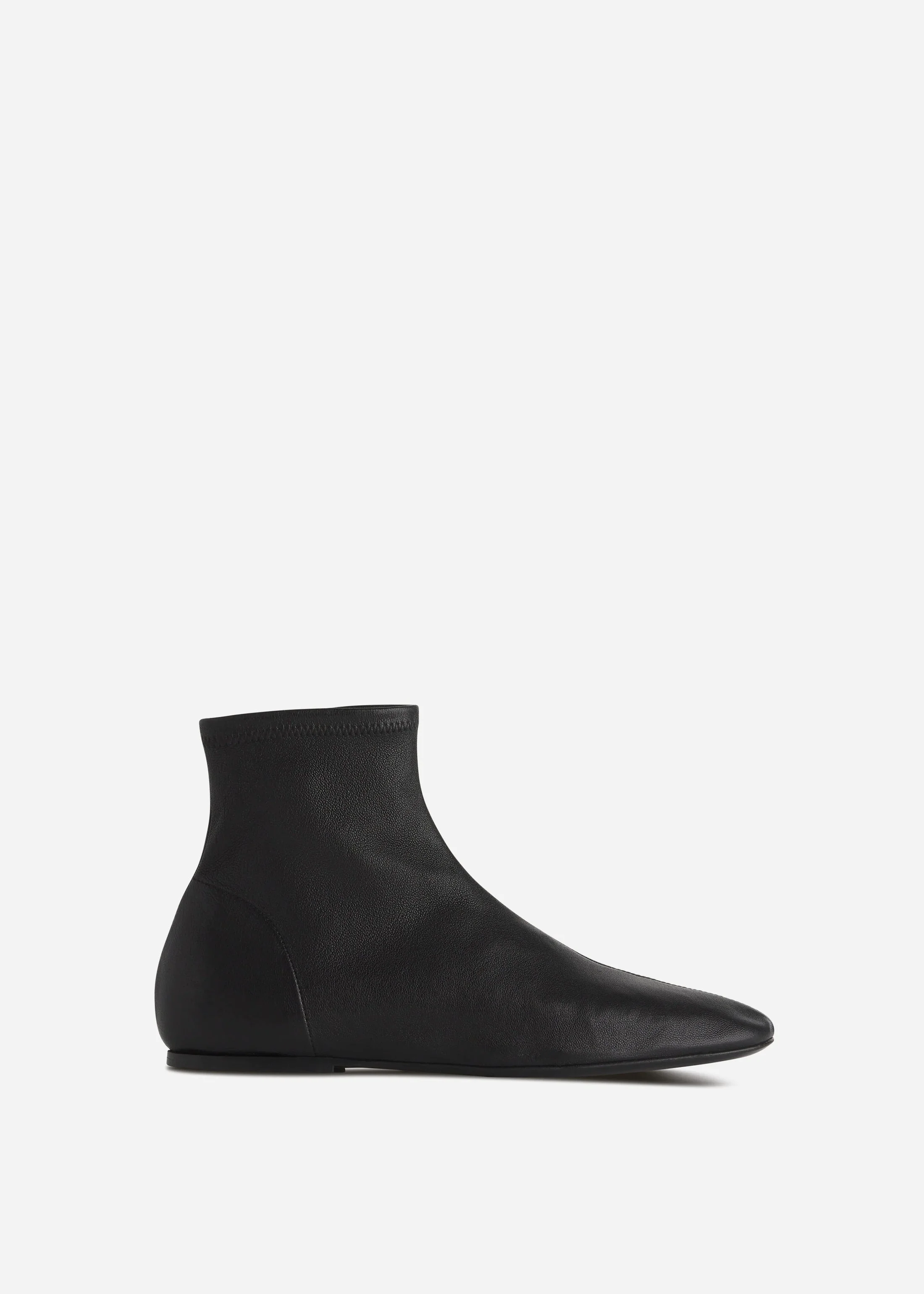 Crafted in Italy from luxurious smooth lambskin leather, this round toe stretch bootie offers both elegance and comfort. Its sleek design features a refined center seam and a soft pointed toe, creating a sophisticated silhouette that complements any ensemble. The stretch material ensures a perfect fit, making it an ideal choice for all-day wear. Details - Black - 100% Lambskin - Made in Italy - Style Number: 0423STL-BLACK Size & Fit - True to size - Heel Heigh 5mm