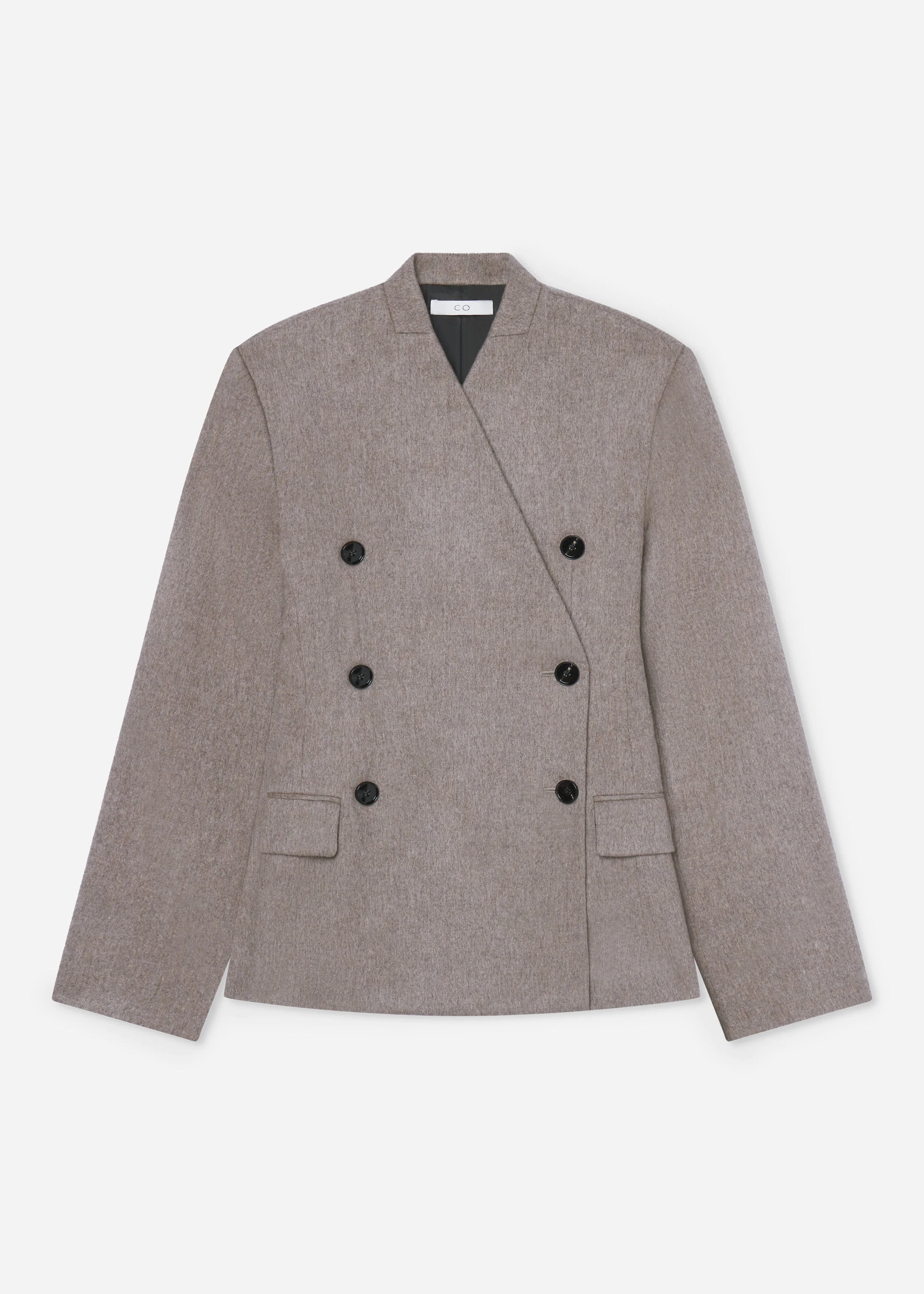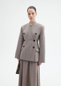 Tailored in soft brushed virgin wool-cashmere blend flannel, this jacket offers a refined reinterpretation of classic suiting. Designed with a sharp, collarless neckline and clean crossover front, the silhouette is sculpted yet relaxed. Detailed with a double-breasted closure and flap pockets, it’s fully lined for ease and comfort. The oatmeal melange tone enhances the texture and softness of the fabric. Details - Oatmeal - 100% Virgin Wool - Fully Lined - Button Closure - Dry Clean Only - Style Number: 6180BWCF-F255 Size & Fit - Designed to be oversized. - We recommend sizing down.