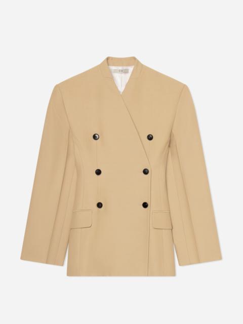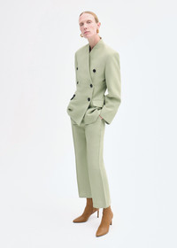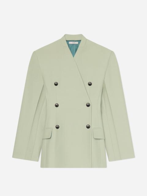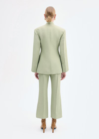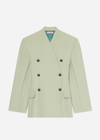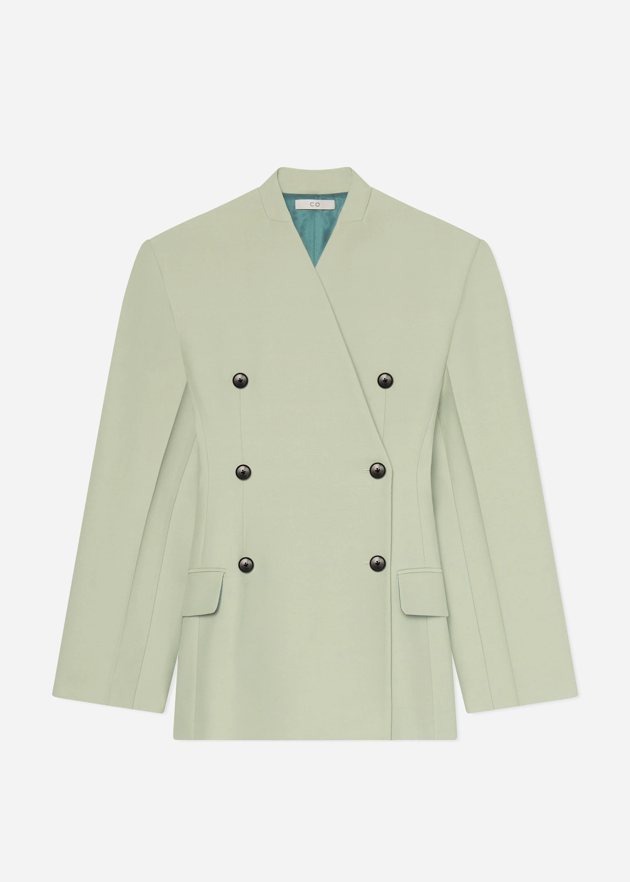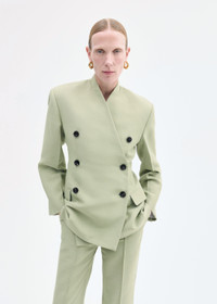 This double-breasted jacket exudes sharp sophistication, crafted from structured faille to create a sculptural shape with a sleek, collarless neckline. Detailed with tonal seams, flap pockets, and contrasting horn buttons, it offers a polished, refined look. Fully lined for a smooth fit, it presents a modern, architectural take on the traditional blazer. Details - Tea Green - 70% Viscose 30% Virgin Wool - Fully Lined - Dry Clean Only - 6983HSF-PF25 Size & Fit - True to size. - Model is 5'10" and wears a size small