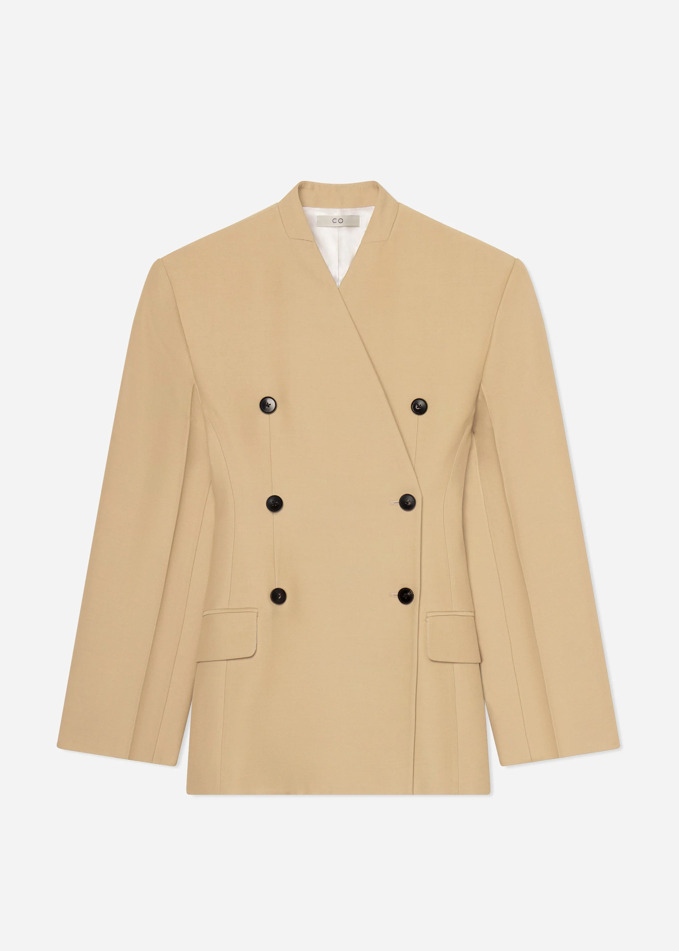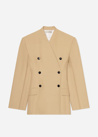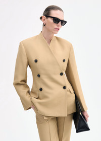 Sharp and refined. This double-breasted jacket is tailored from structured faille with a sculptural silhouette and clean, collarless neckline. Finished with tonal seaming, flap pockets, and horn buttons for a refined contrast. Fully lined for a smooth, polished fit—an architectural alternative to the classic blazer. Details - Camel - 70% Viscose 30% Virgin Wool - Fully Lined - Dry Clean Only - 6983HSF-PF25 Size & Fit - True to size. - Model is 5'10" and wears a size small