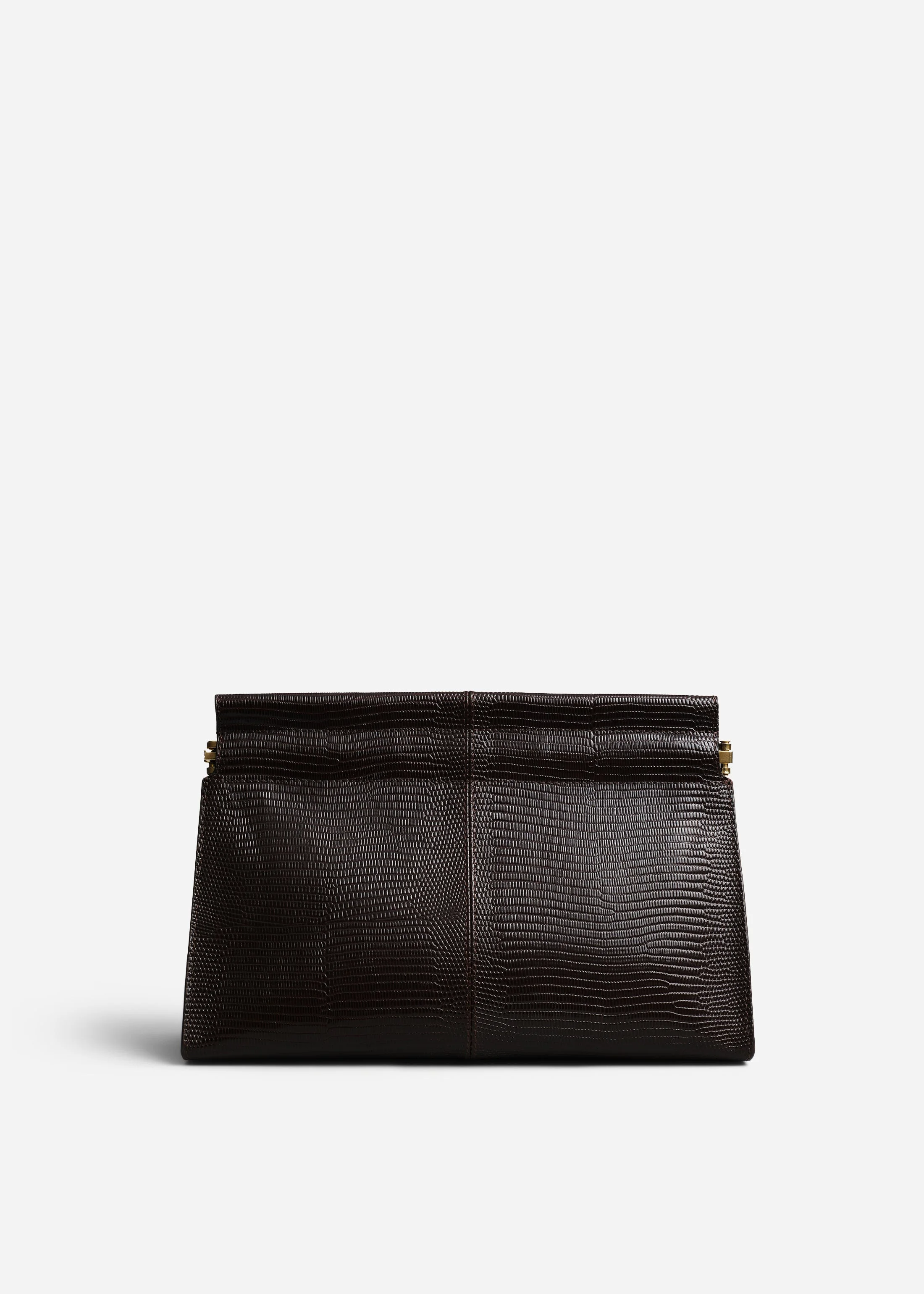 This snap-frame clutch features stamped leather with a suede interior and elegant gold hardware. It includes an inner pocket for cards and is expertly crafted in Italy. Details - Espresso Brown - 100% Leather - Suede Interior - Inner Card Pocket - Made in Italy - 0452LIZ-ESP Size & Fit - (W)26cm x (L)16.5cm x (D)8cm