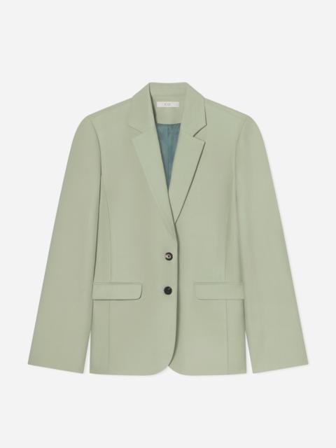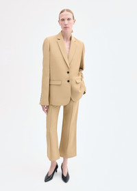 A timeless essential, redefined. This structured blazer is tailored from a smooth camel suiting fabric with a two button closure at center front and buttons on cuff. Features include peak lapels, flap pockets, and a two-button front closure. Fully lined for ease and polish—ideal for pairing with its matching trouser or elevating off-duty looks. Details - Camel - 70% Viscose 30% Virgin Wool - Dry Clean Only - 6888HSF-PF25 Size & Fit - True to size. - Model is 5'10" and wears a size small