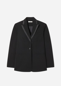 An elegant reinterpretation of classic tailoring, this single-breasted tuxedo blazer is cut from stretch virgin wool with silk satin lapel detailing. Designed for a slim straight silhouette, it offers a refined silhouette with year-round wearability. Finished with jetted pockets, a chest welt pocket, horn buttons, and a softly structured shoulder. Details - 95% Virgin Wool 5% Elastane - Black - 6101ABSW-CORE Size & Fit - Size small - Approx 31" in overall length