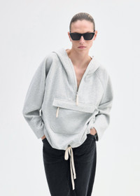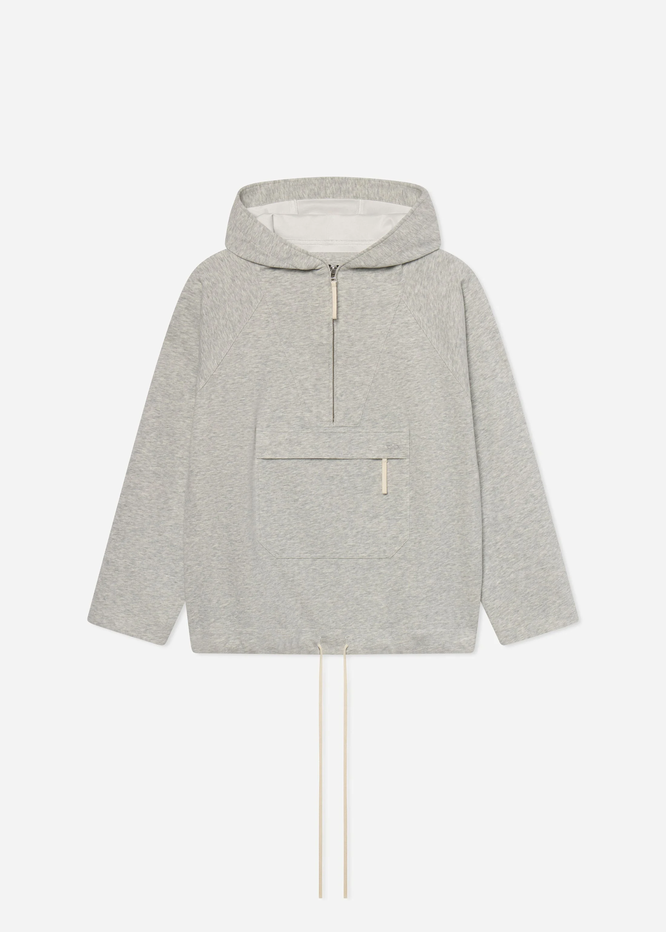 A polished essential for casual wear, this workwear-inspired hoodie features a half-zip neckline and raglan sleeves for ease of movement. Crafted from soft, durable cotton with a subtle grain texture, it echoes the structured, sculptural feel of scuba jersey. Designed for comfortable layering with a relaxed fit, and finished with a drawstring and self-fabric tunnel at the hem for adjustable styling. Details - Heather Grey - 60% Cotton 40% Tencel - 6624CSNL-CORE Size & Fit - True to size - Approx 24" in overall length. - Model is 5'9" and wears a size Small.