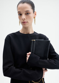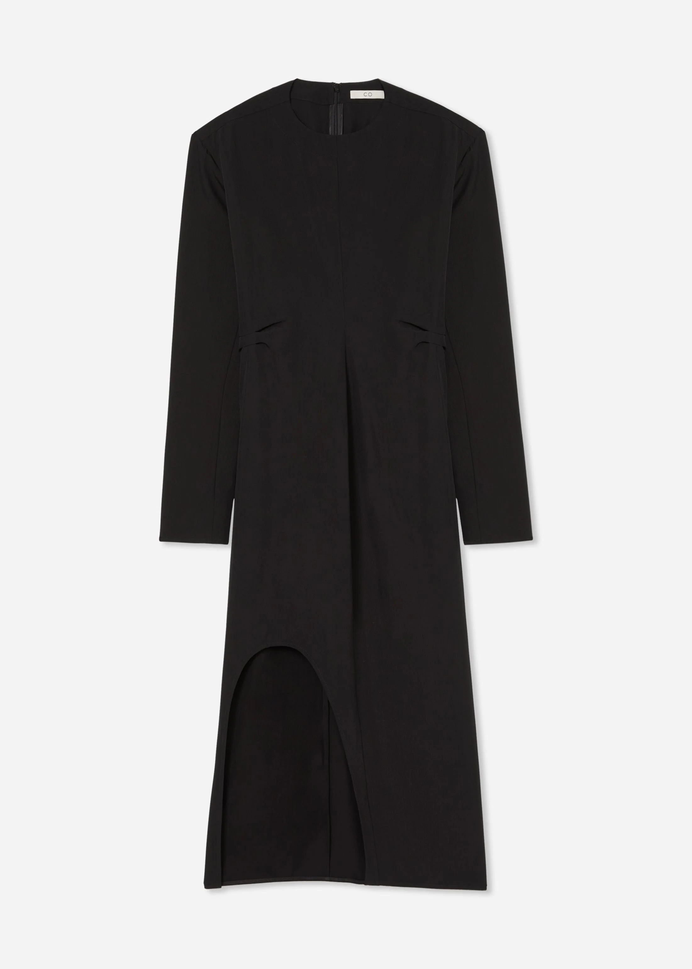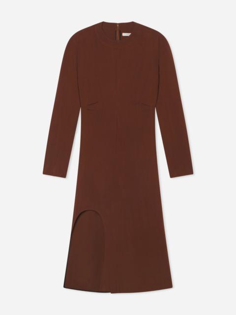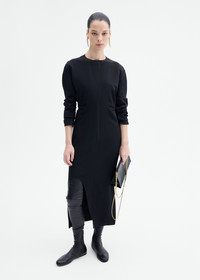 Tailored in a fluid yet structured viscose wool blend, this long-sleeved dress features a minimalist silhouette with subtle bust darting and a sculptural keyhole hem detail. Complete with a clean crew neckline and concealed back zipper. Rendered in classic black, this dress offers quiet drama and versatility. Details - Black - 74% Viscose 26% Virgin Wool - Back Zipper Closure - Dry Clean Only - Style Number: 4034BVW-F25 Size & Fit - True to size. - Designed to be fitted.