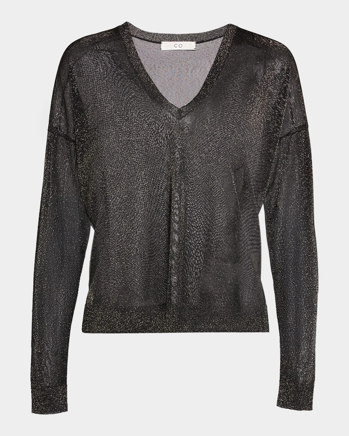 Co sweater is crafted from lightweight sheer metallic knit V neckline Long sleeves Drop shoulders Loose fit Ribbed cuffs and hem Pullover style Rayon/cellulose acetate/Lurex® metallic fibers Imported