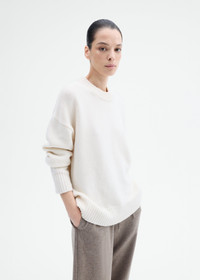 This oversized, comfortable crew neck sweater is crafted from a wool-cashmere blend yarn. It showcases a relaxed boxy shape complemented by timeless ribbed detailing at the neckline, cuffs, and hem. Details - Ivory - 70% Wool, 30% Cashmere - Dry Clean Only - Ribbed Details at Neckline, Cuffs, and Hem - Style Number: 7682WCM-CORE Size & Fit - Designed for a longer, relaxed fit. - Measures 26" in total length - Model is 5'10" wears a size Small.