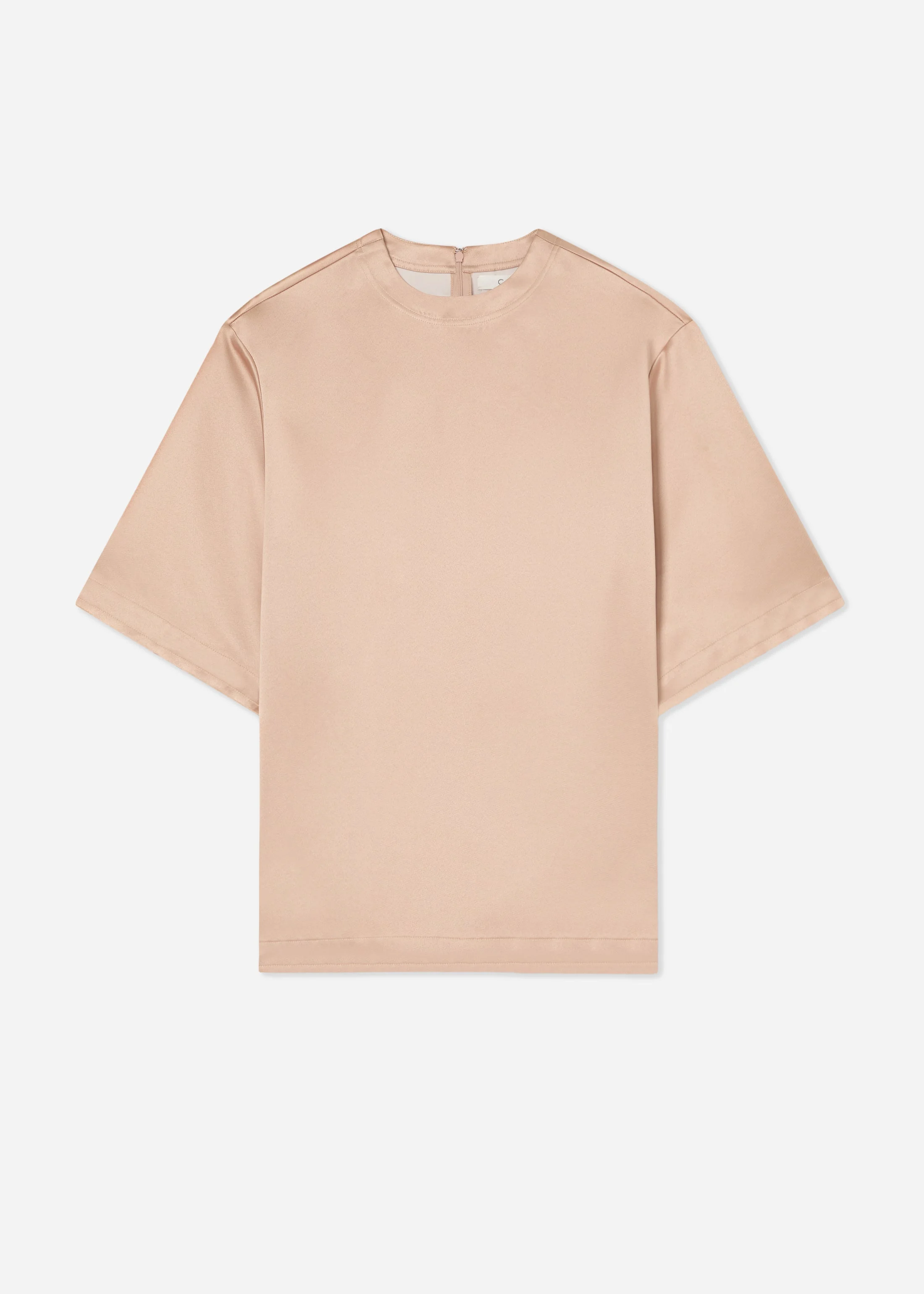 Crafted from lustrous duchess satin, this sculptural top combines structure with ease. Designed with a round neckline and wide short sleeves, the silhouette is clean and architectural, draping softly through the body. Finished with a concealed zipper at the back for a refined, minimal look. Details - Pink Champagne - 100% Polyester - Dry Clean Only - Back Concealed Zipper - Style Number: 1066MBPD-PS26 Size & Fit - Designed for a relaxed, boxy fit that drapes softly through the body - Size down for a more tailored silhouette - Concealed back zipper for easy closure - Measures 29" from shoulder to bottom hem - Model Height is 179 cm / 5'11 in